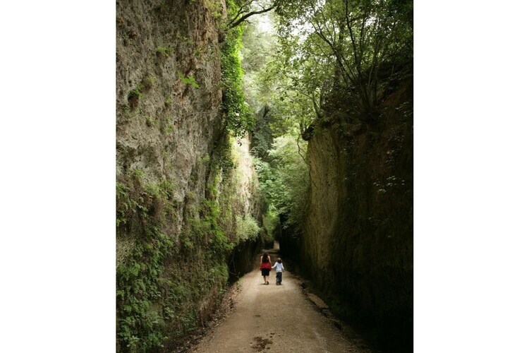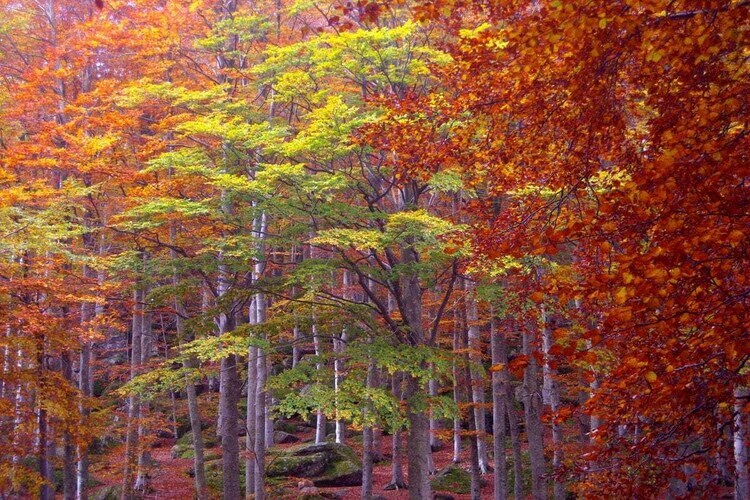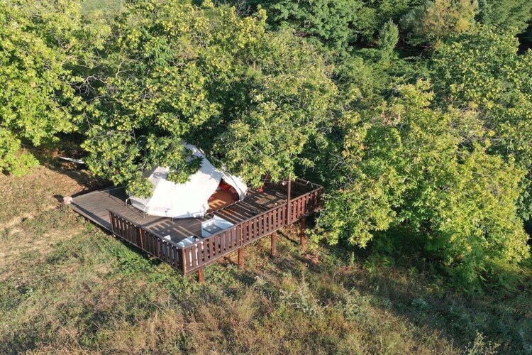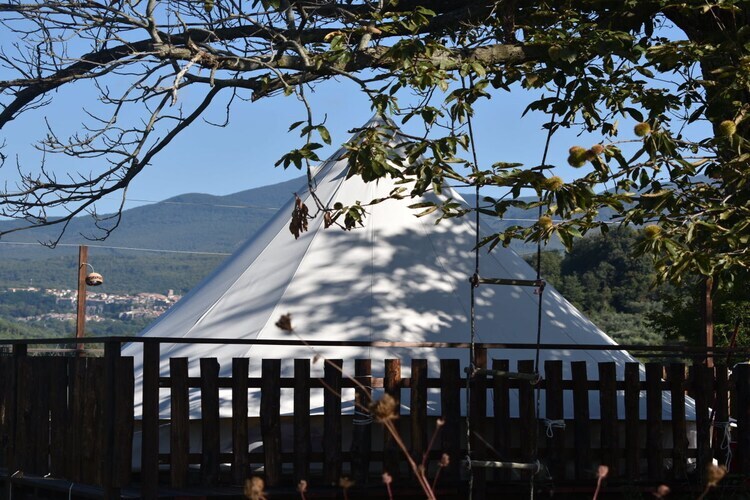 La tente est située sur une grande terrasse en bois, ombragée par des châtaigniers centenaires, offrant une intimité maximale.
