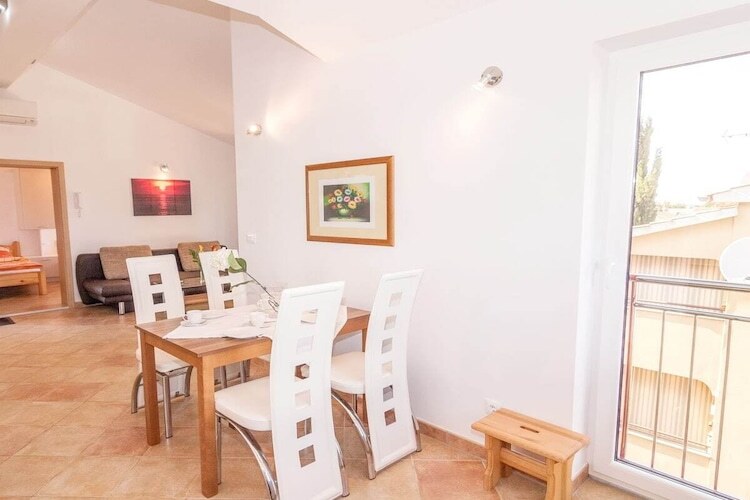 Atout majeur de cet appartement : toutes les pièces et le grand balcon avec coin salon offrent une vue imprenable sur la mer Adriatique, la vieille ville de Porec et l'île voisine de Sveti Nikola.