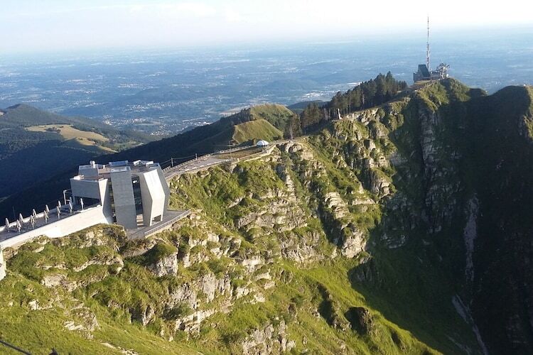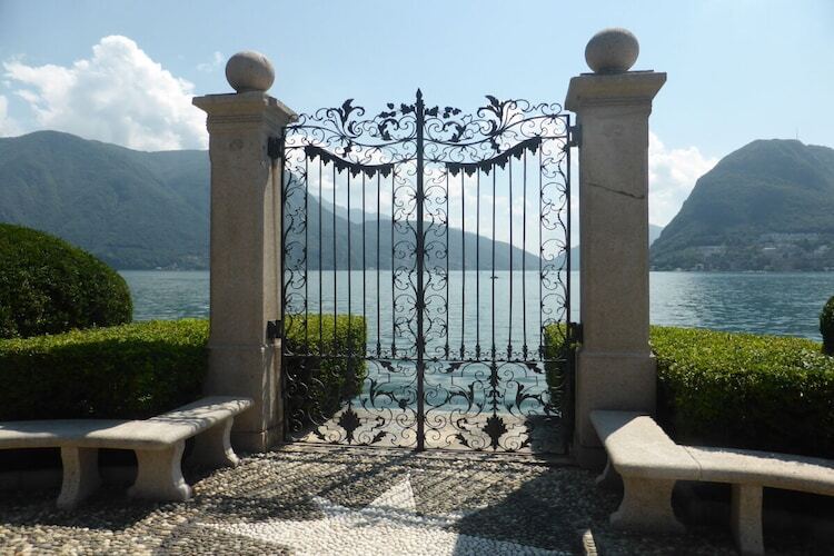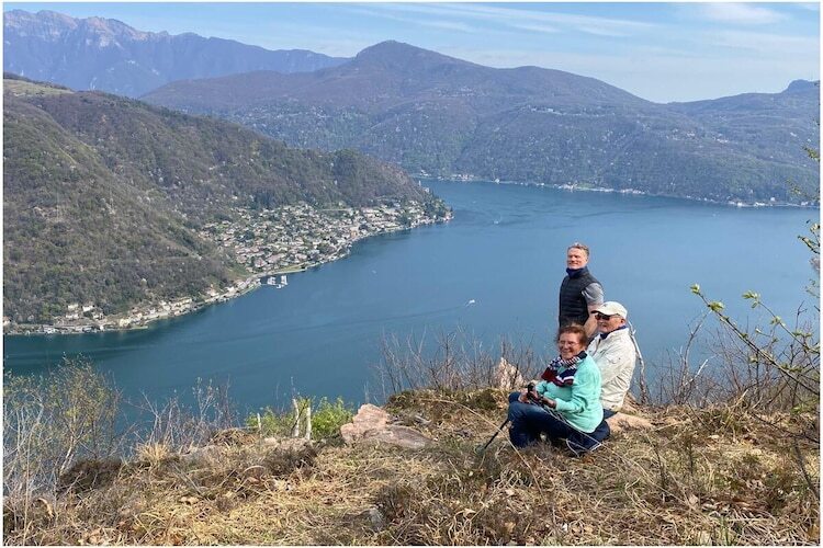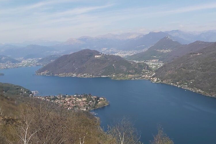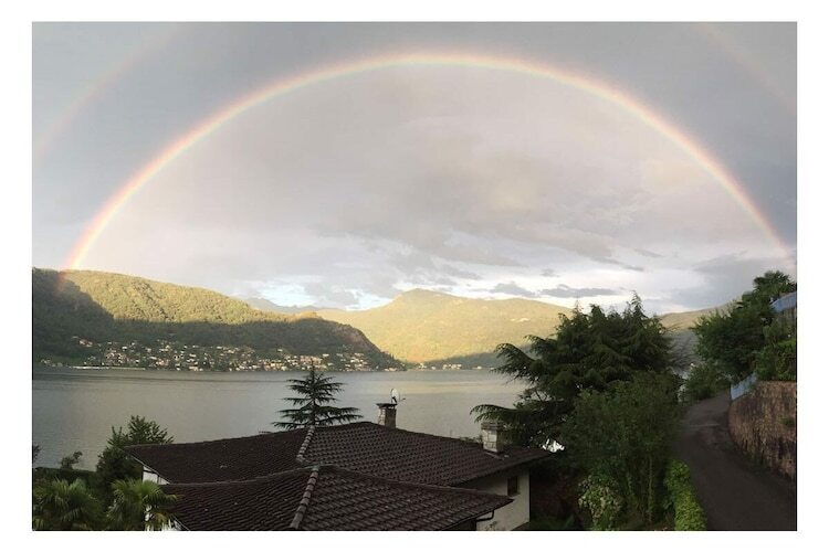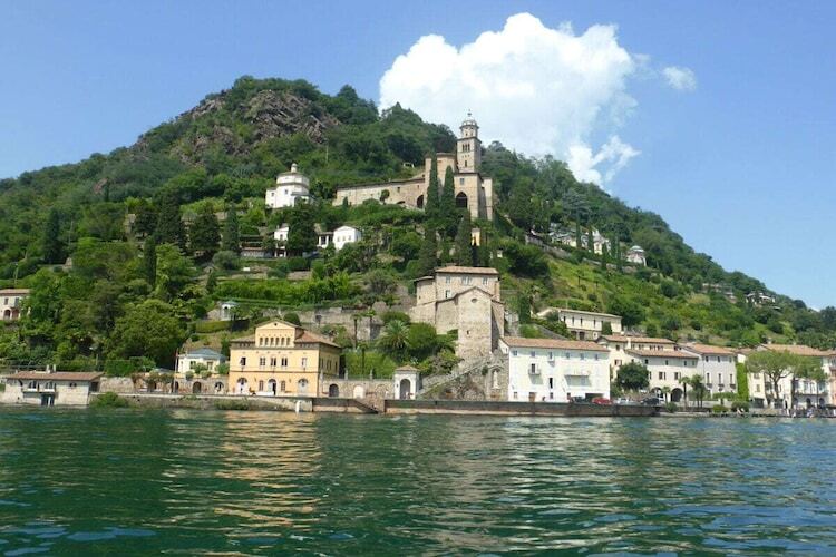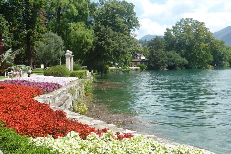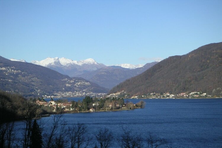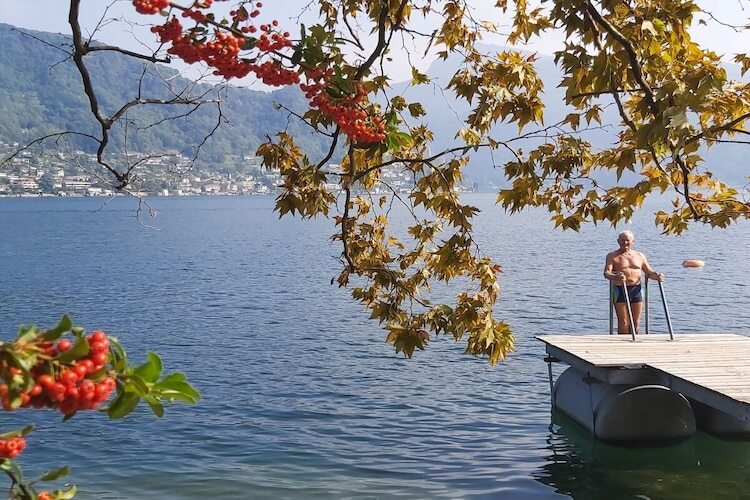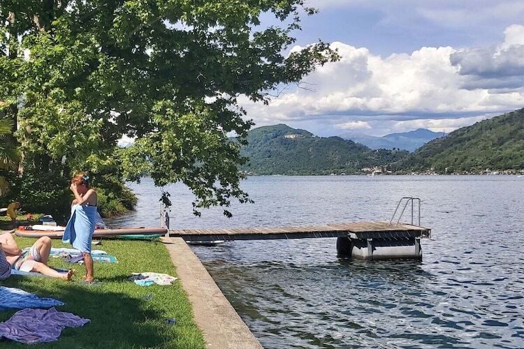 Grande terrasse-jardin offrant une vue imprenable sur le lac et les montagnes. La plage privée, avec pelouse et pontons, est à quelques pas.