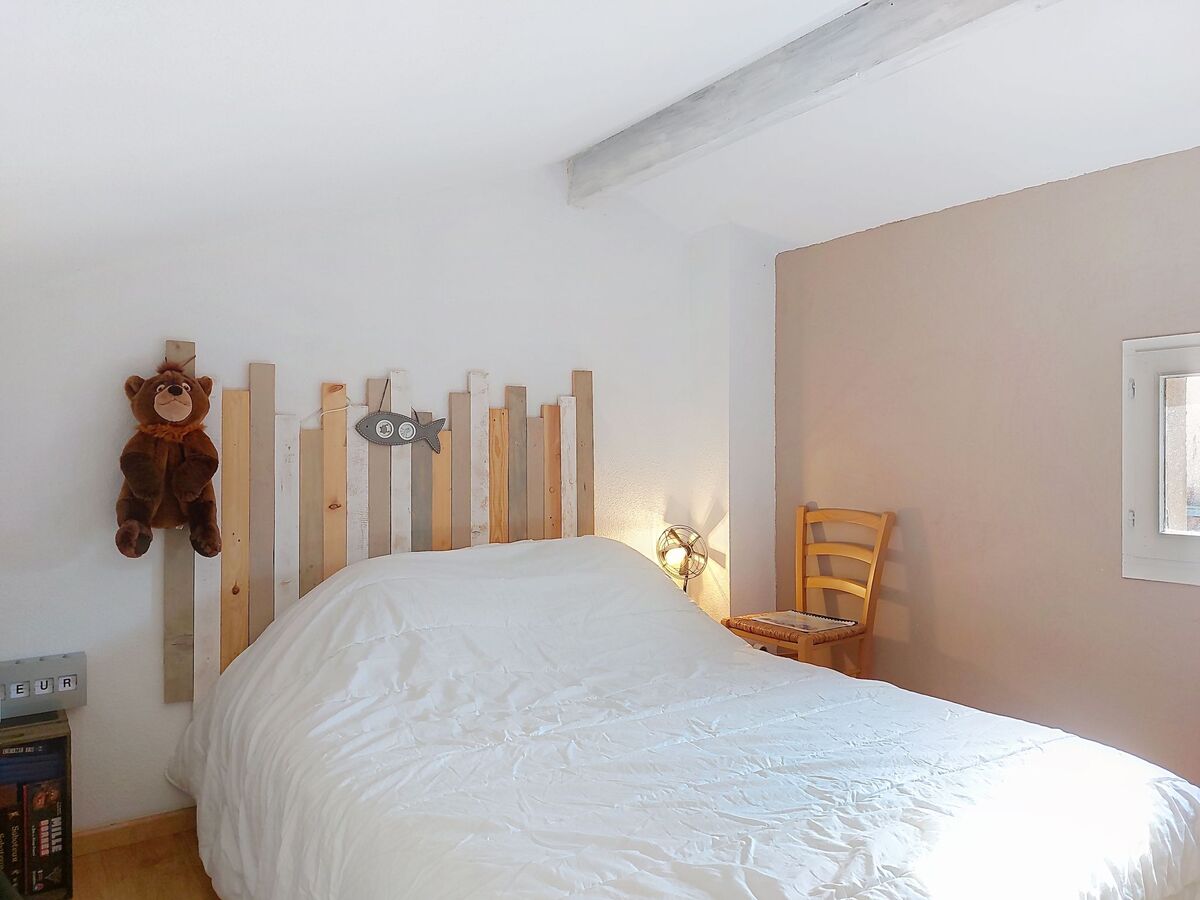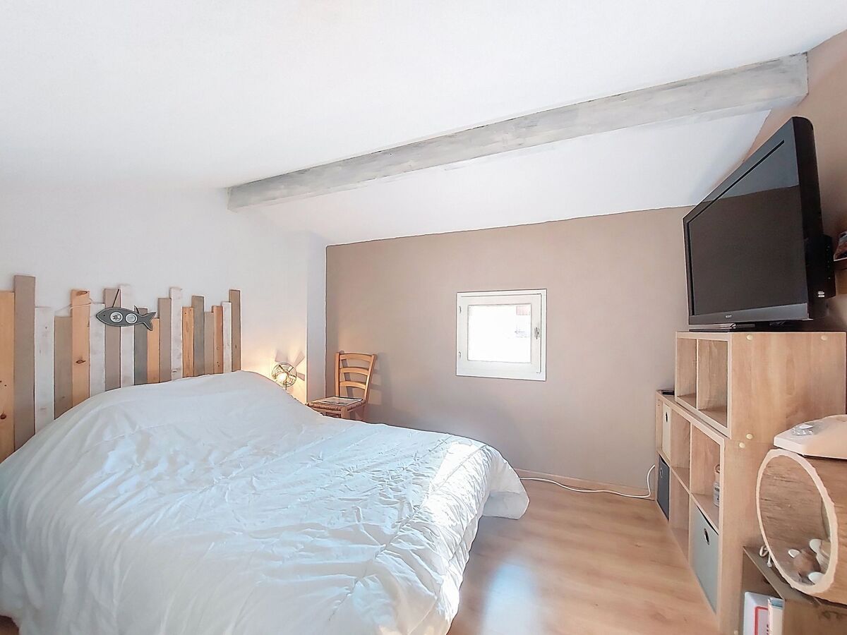 À l'étage supérieur: (escalier raide) galerie mansardée avec 1 grand-lit (1 x 160 cm, longueur 190 cm), TV (écran plat).