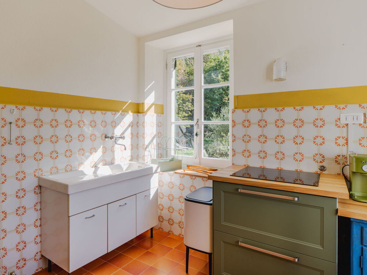 Cuisine (4 plaques à induction, bouilloire électrique, micro-ondes, cafetière électrique) avec table pour les repas.
