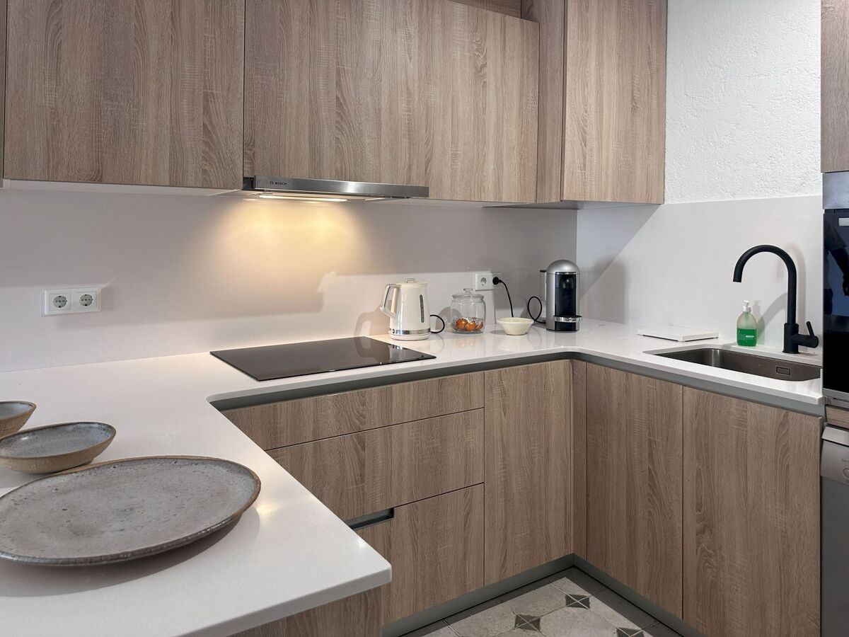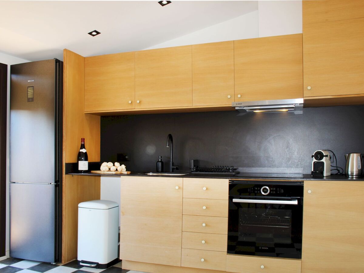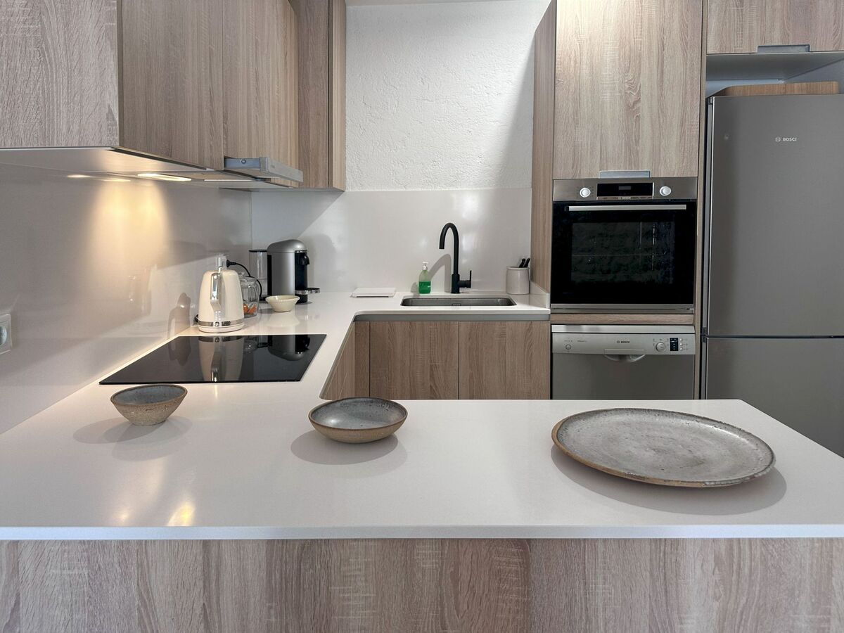 Cuisine ouverte (four, lave-vaisselle, 4 plaques à induction, grille-pain, bouilloire électrique, cafetière électrique).