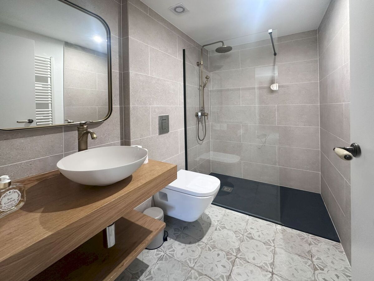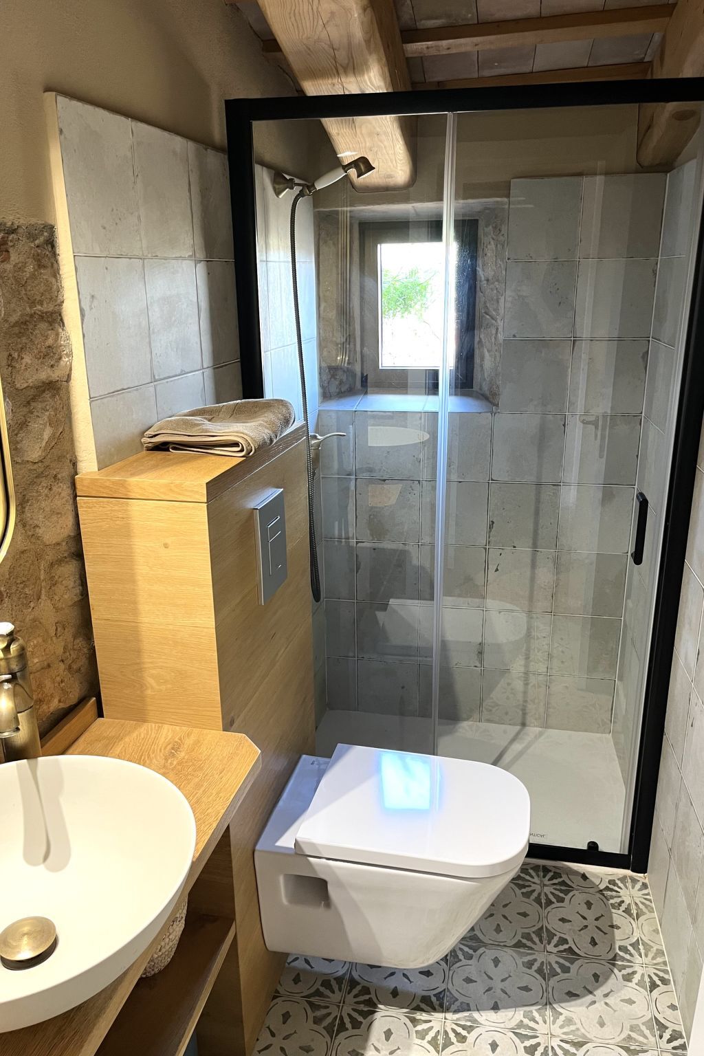 1 chambre avec 1 grand-lit (140 cm, longueur 190 cm), douche/WC.