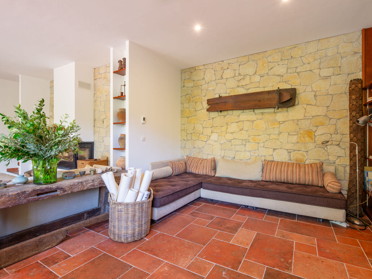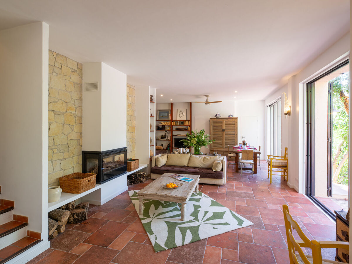 À l'étage inférieur: séjour/salle à manger avec 1 divan-lit double (2 x 80 cm, longueur 200 cm), cheminée et ventilateur.