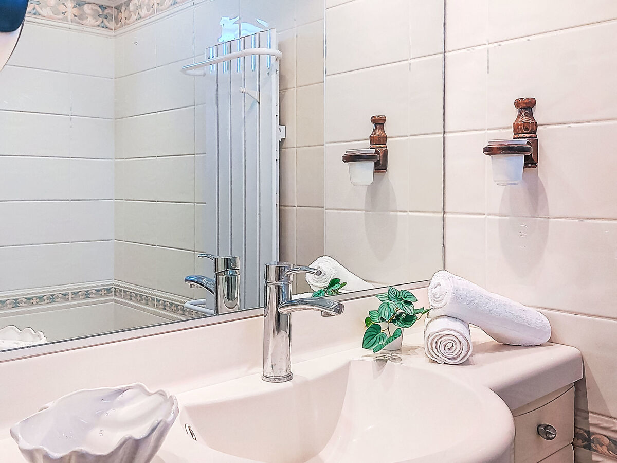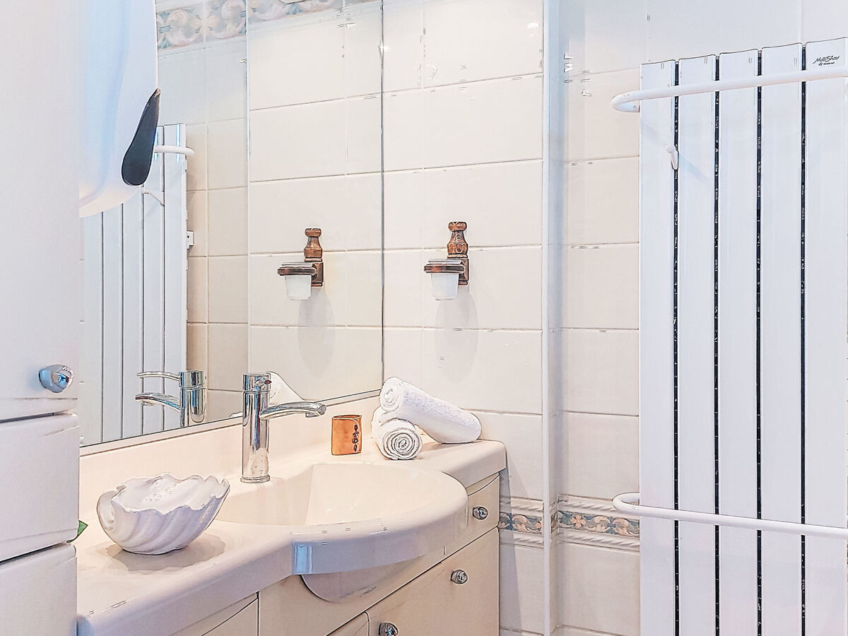 À l'étage inférieur: 1 chambre avec 1 grand-lit (140 cm, longueur 190 cm), salle de bains et WC séparés.