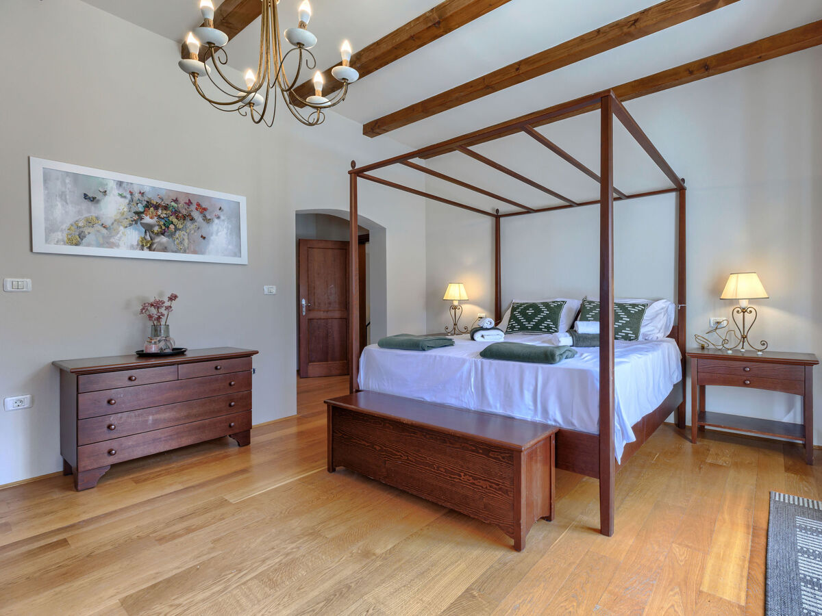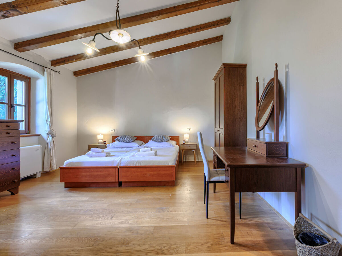 À l'étage supérieur: 1 chambre avec 1 grand-lit (180 cm, longueur 200 cm), bain/douche/WC et air-conditionné.