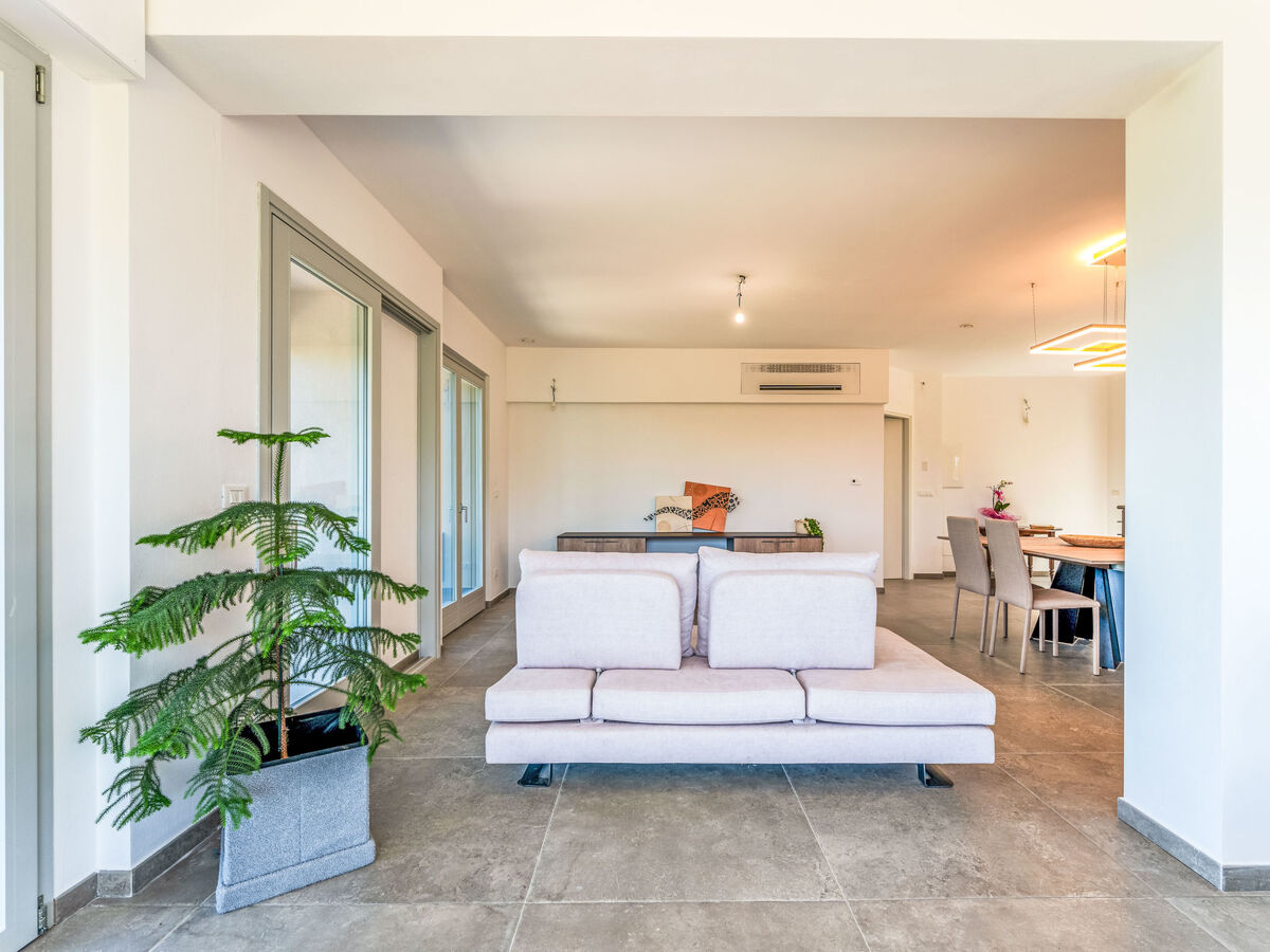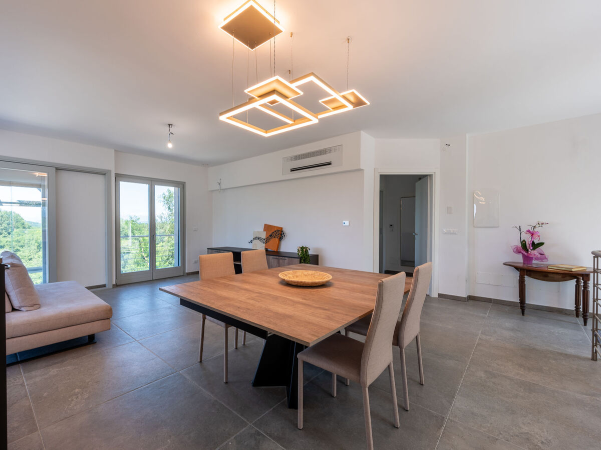 Clair, aménagement moderne et de bon goût: séjour/salle à manger avec baie vitrée avec 2 divans-lits (longueur 190 cm), table pour les repas et TV.