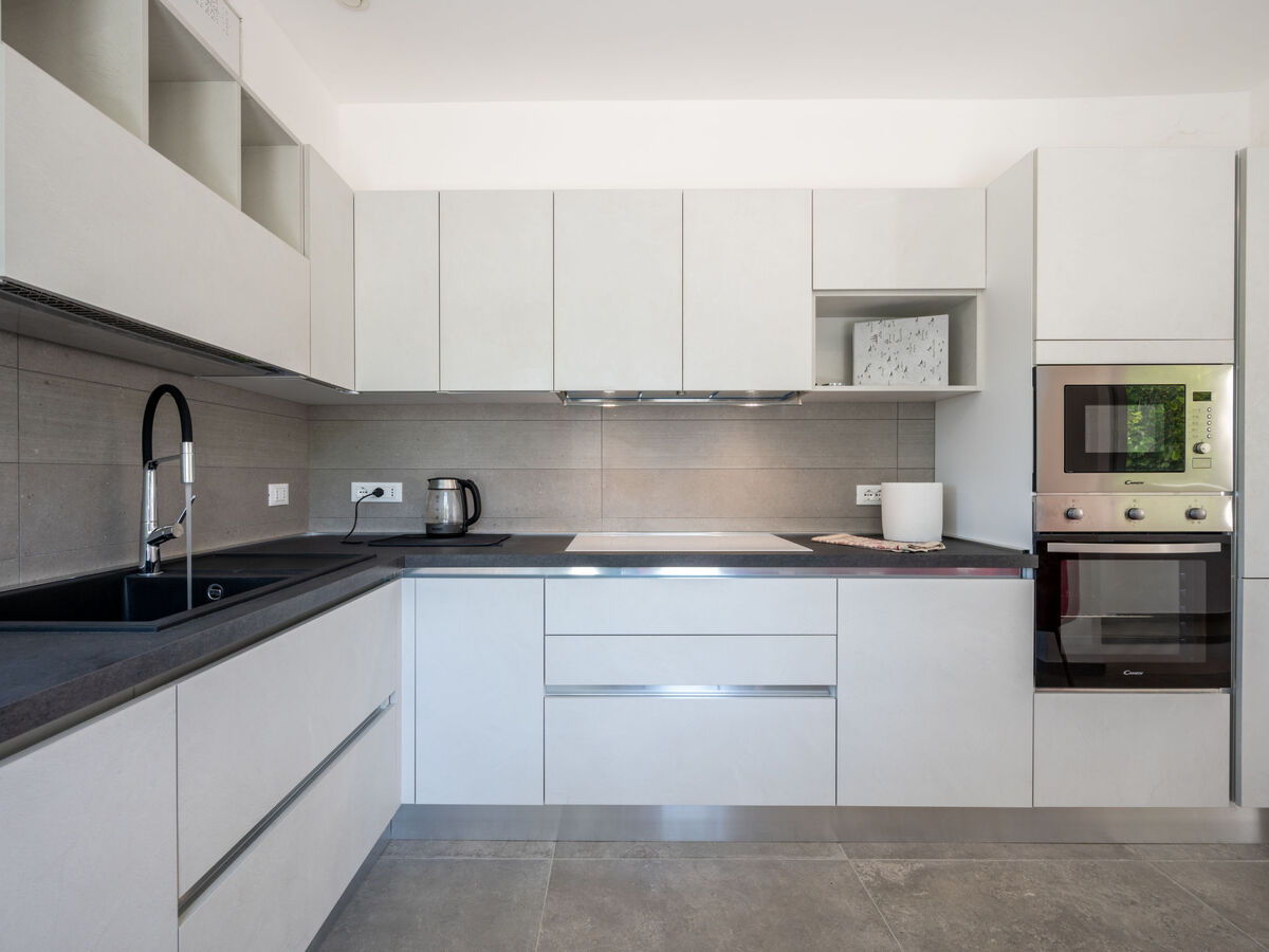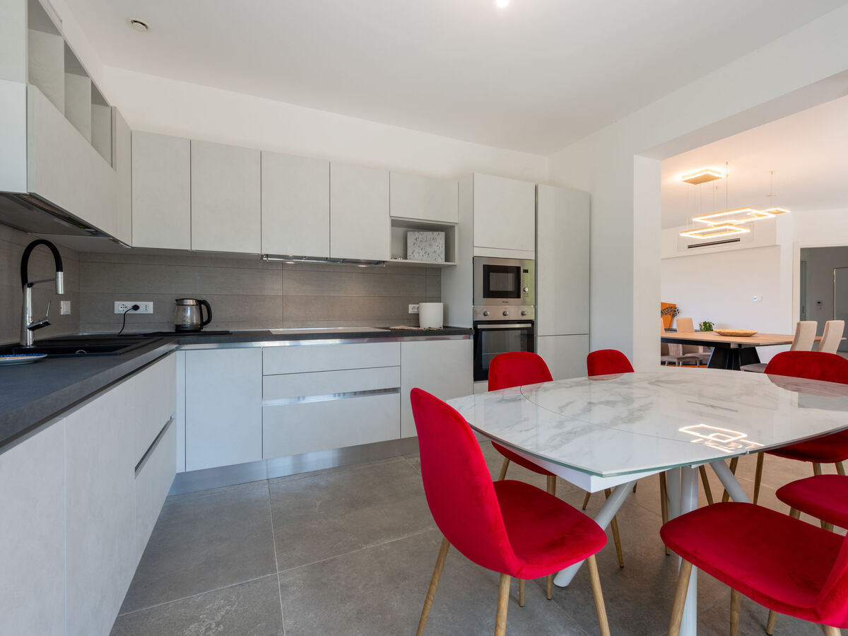 Cuisine/séjour (four, lave-vaisselle, 4 plaques à induction, bouilloire électrique, micro-ondes, cafetière électrique) avec table pour les repas.