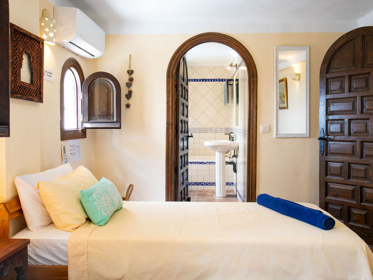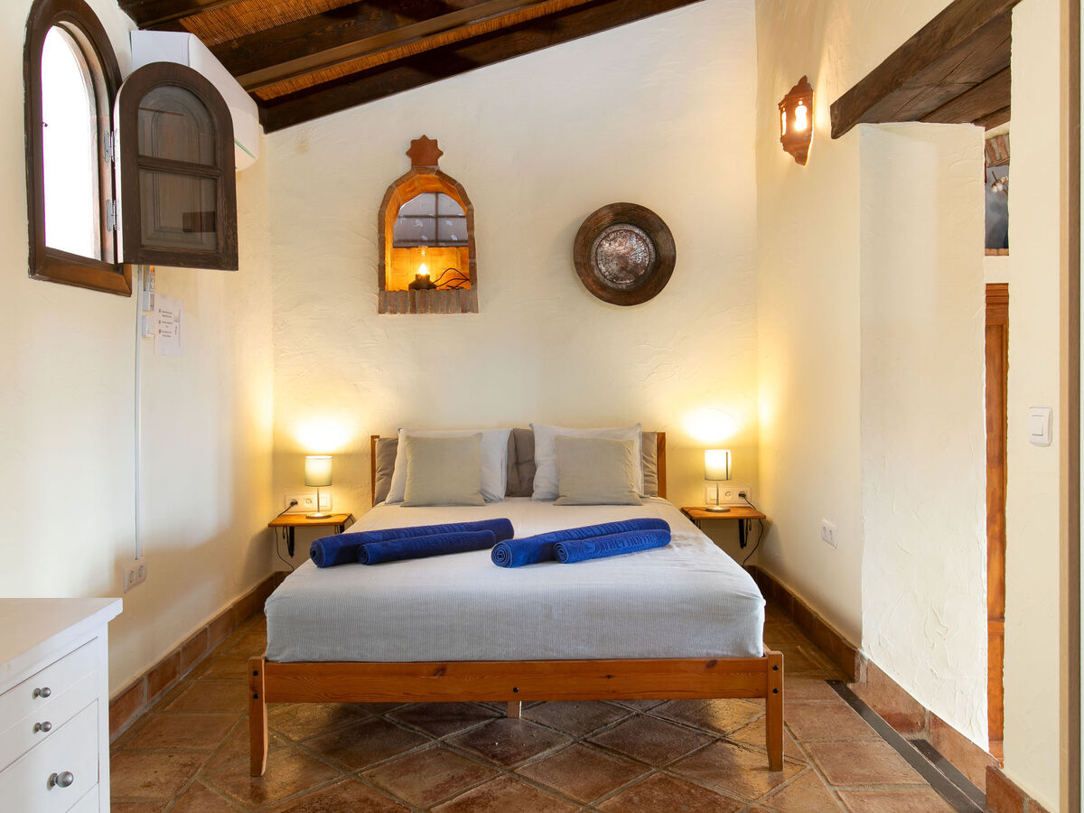1 chambre avec 1 grand-lit (180 cm, longueur 200 cm), douche/WC et air-conditionné.