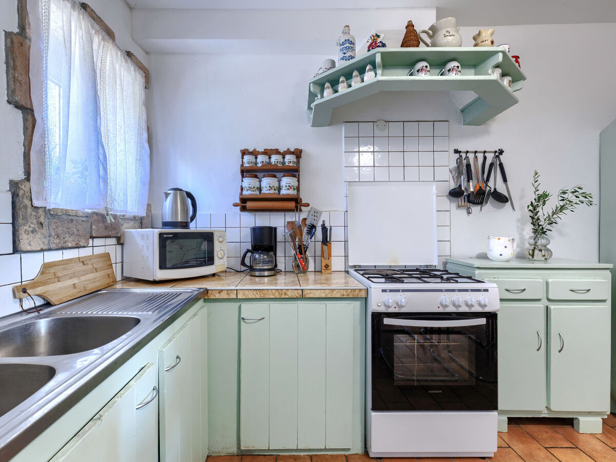 Cuisine (1 plaque de cuisson, four, 3 feux, grille-pain, bouilloire électrique, micro-ondes, congélateur, cafetière électrique) avec table pour les repas.