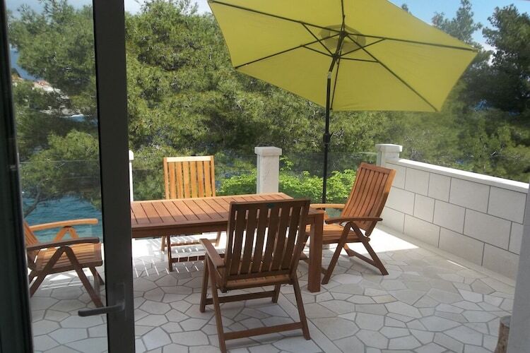 La terrasse vous offre une magnifique vue mer, un store banne, un salon de jardin et un parasol.