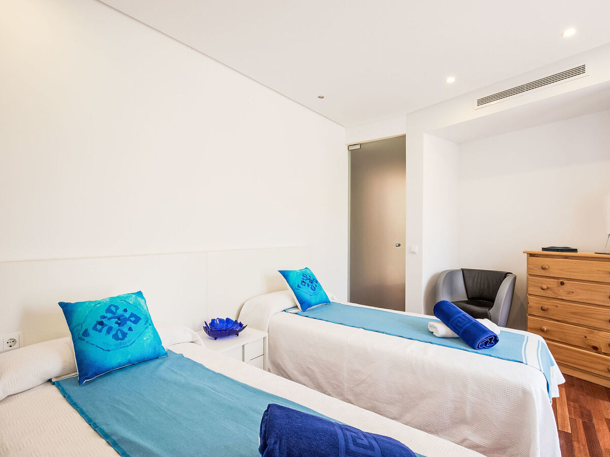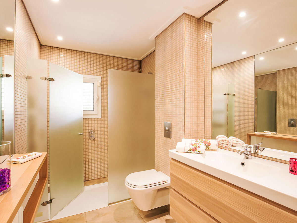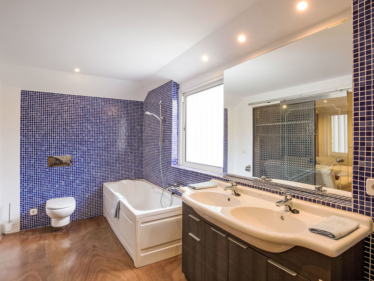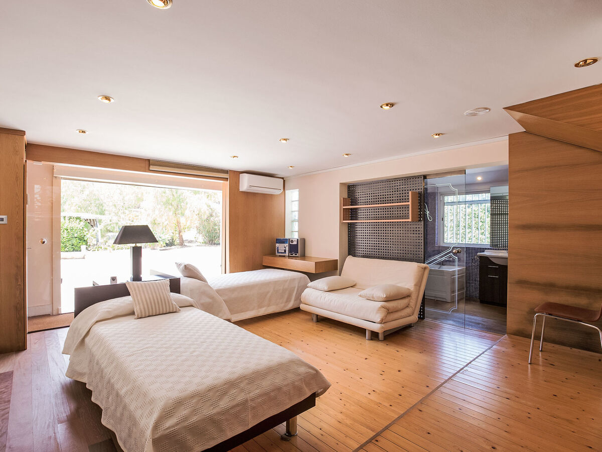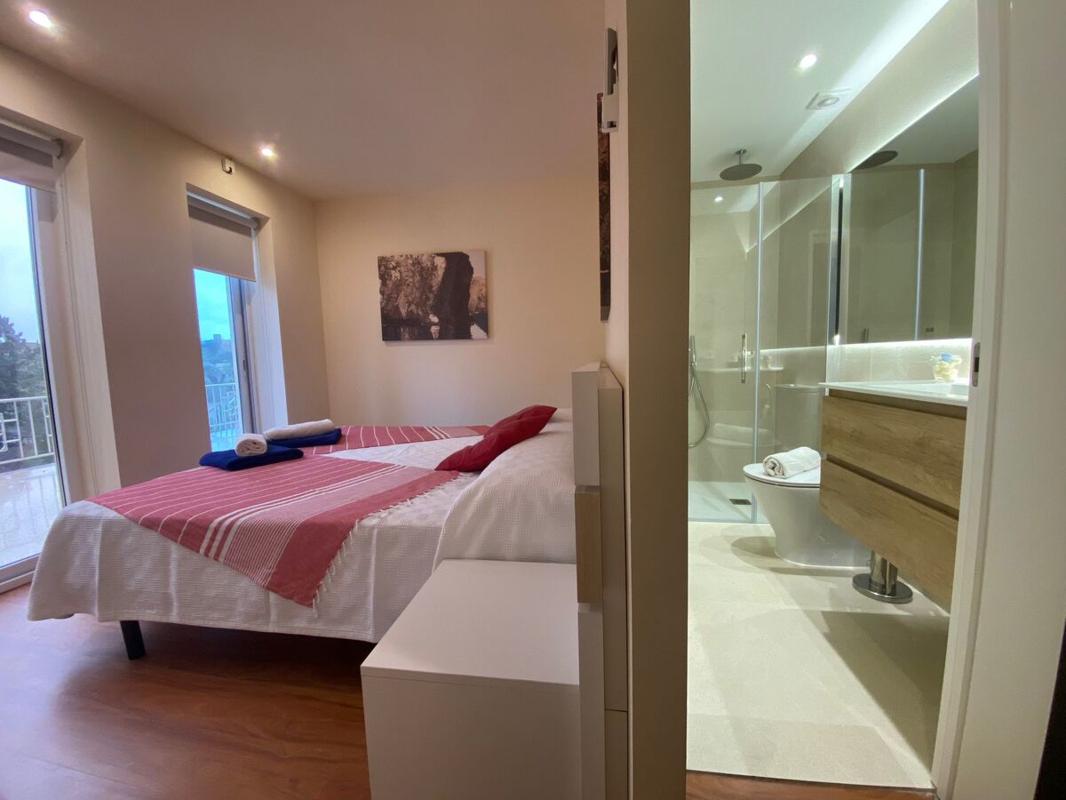 1 grande chambre double avec baie vitrée avec 2 lits (90 cm), bain/bidet/WC, double vasque, air-conditionné et chauffage à air chaud.