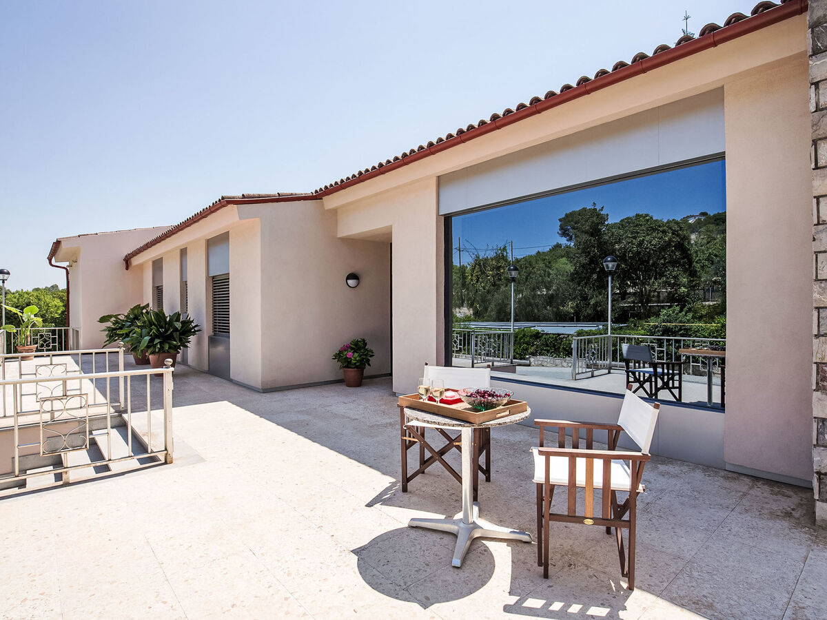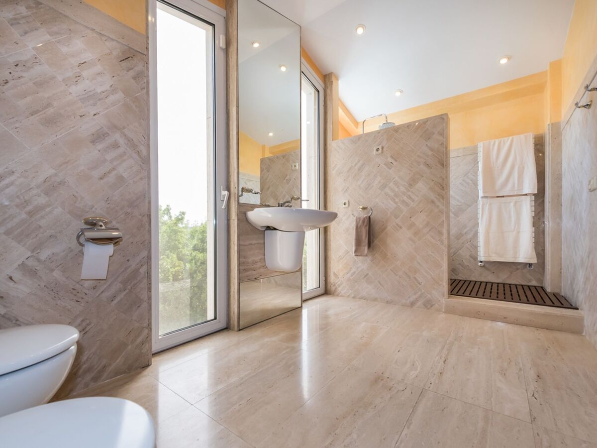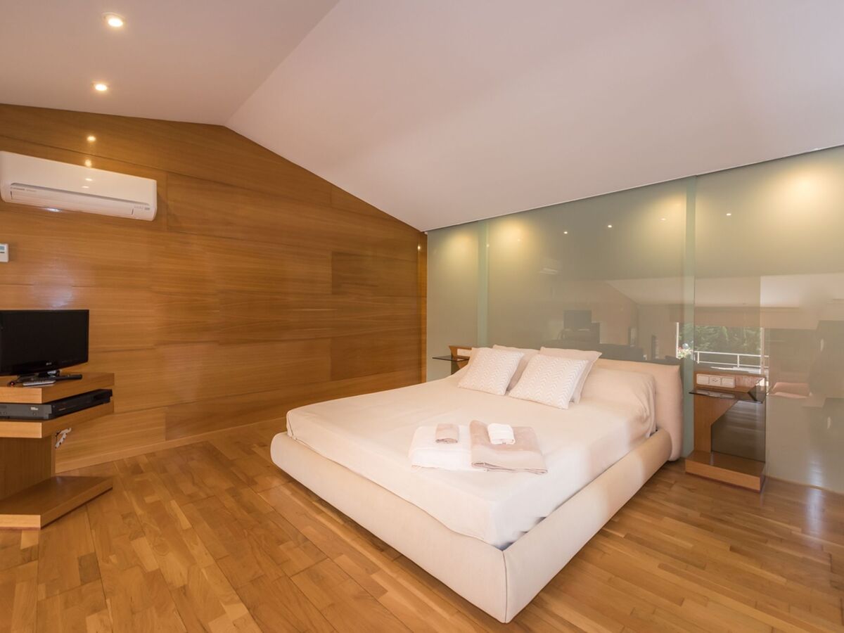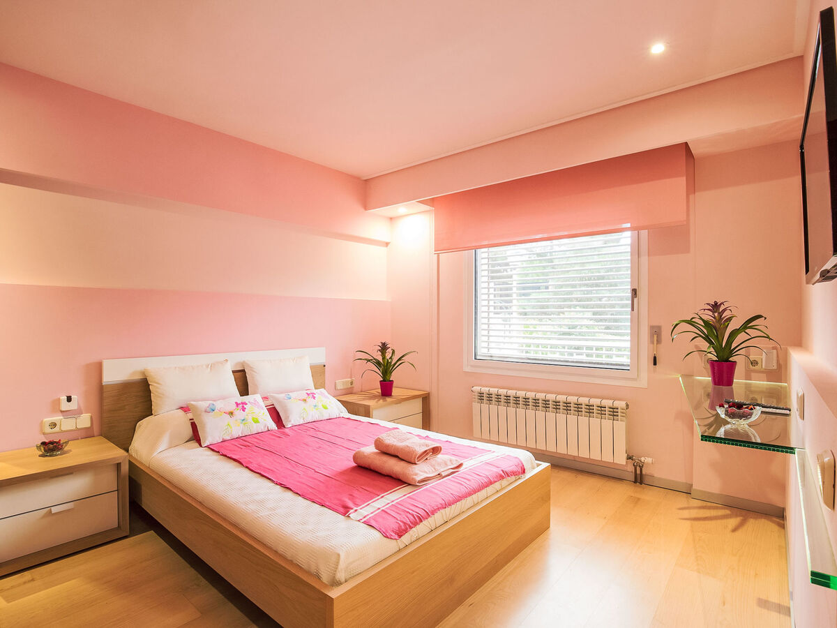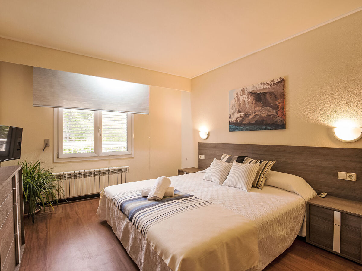 1 grande chambre double avec baie vitrée avec 2 lits (90 cm), bain/bidet/WC, double vasque, air-conditionné et chauffage à air chaud.
