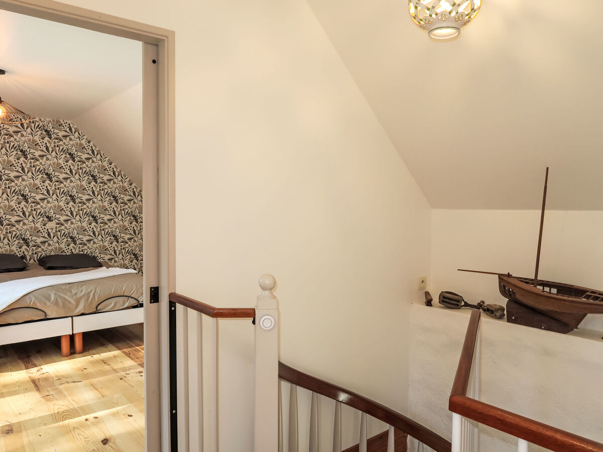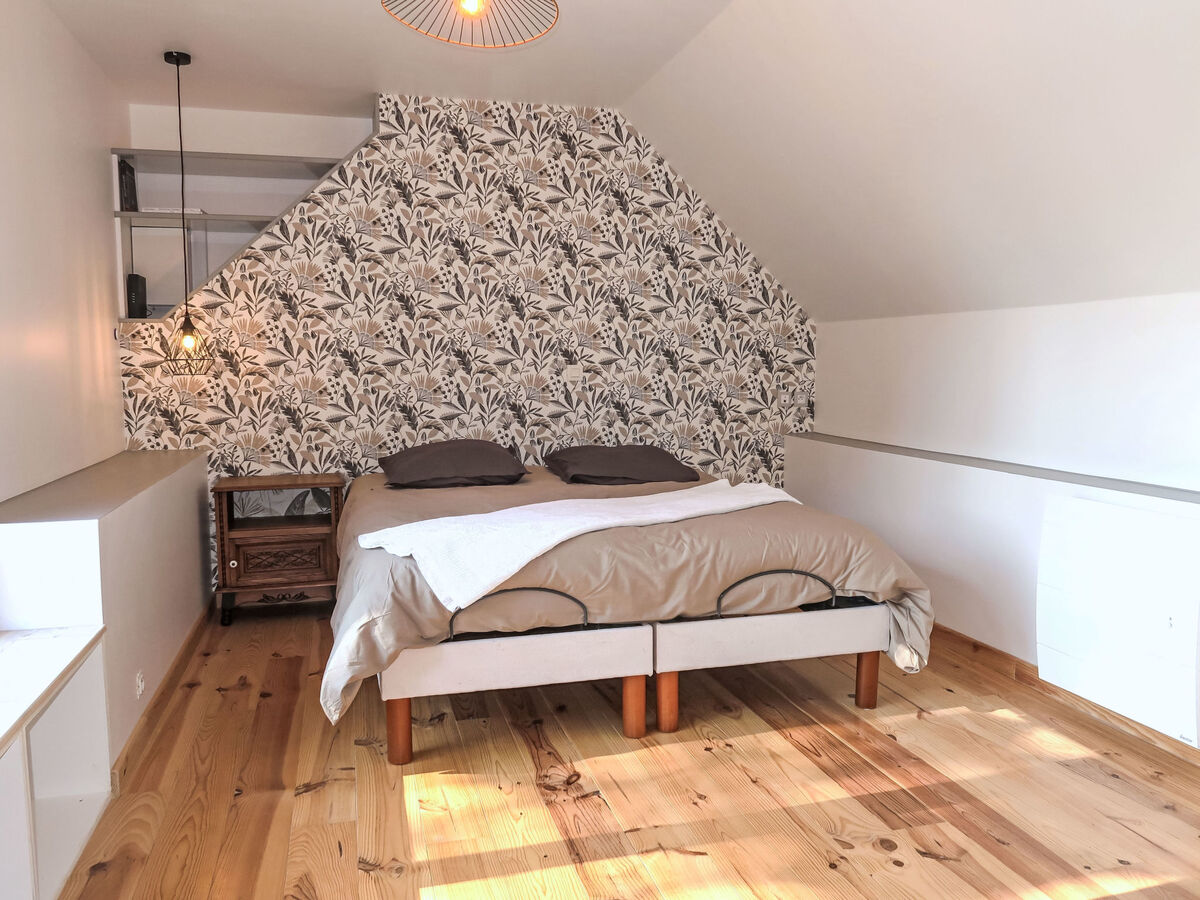 À l'étage supérieur: 1 chambre 15 m2, mansardée avec 1 lit double (90 cm, longueur 190 cm).
