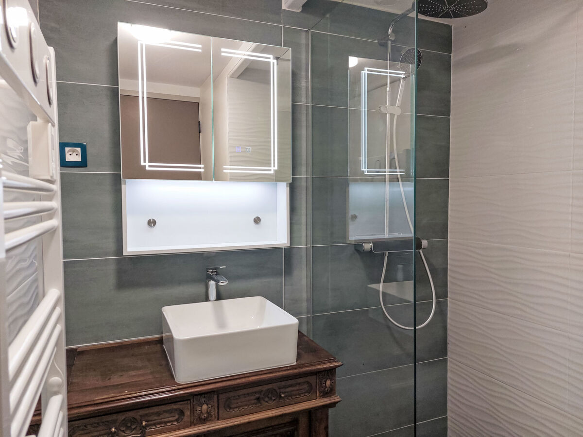 Cuisine ouverte (four, lave-vaisselle, 4 plaques à induction, grille-pain, bouilloire électrique, micro-ondes, congélateur, cafetière électrique).