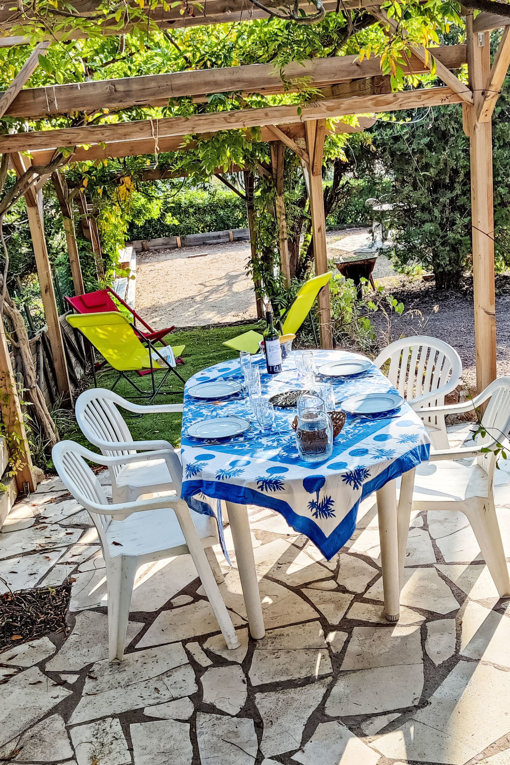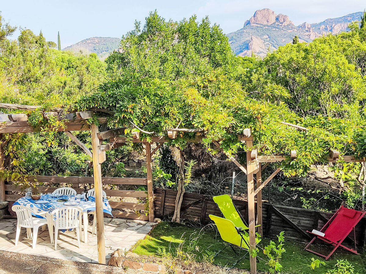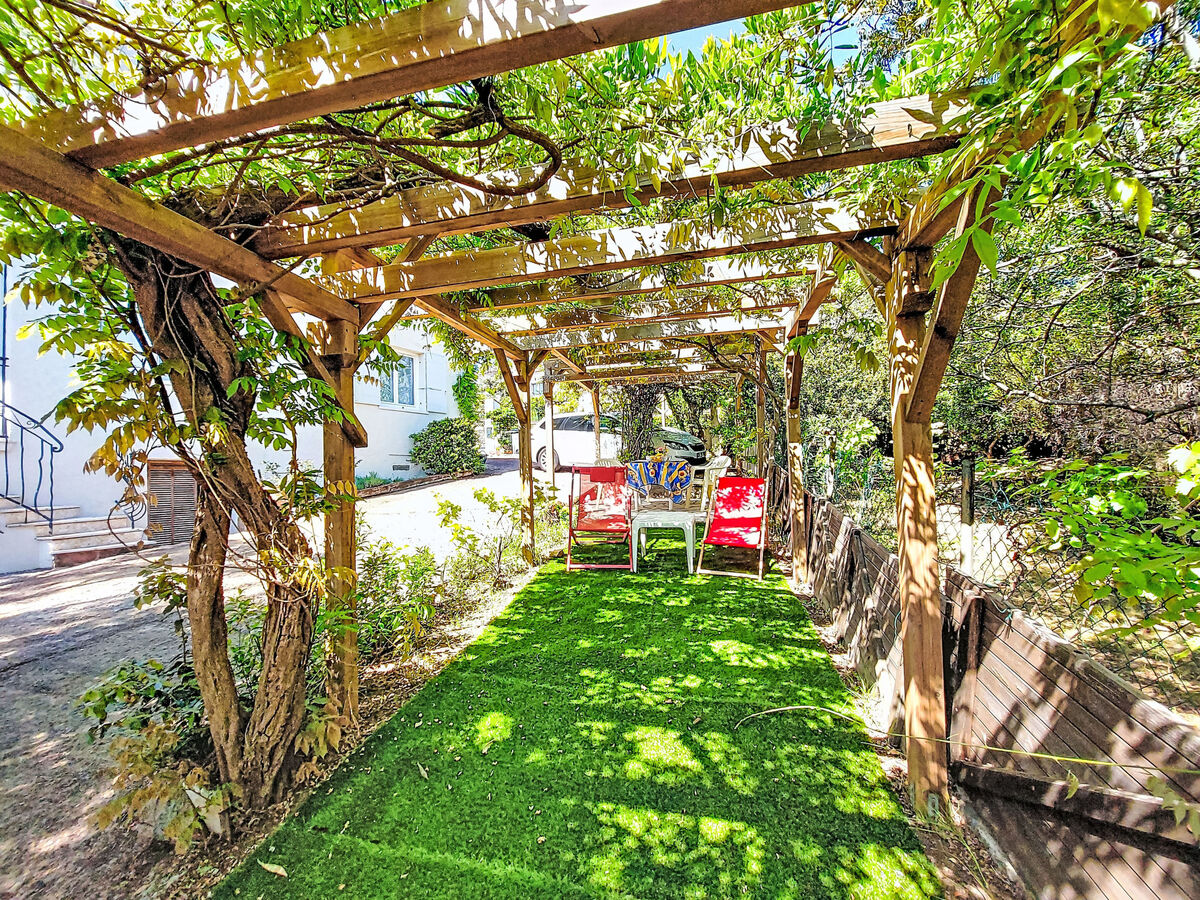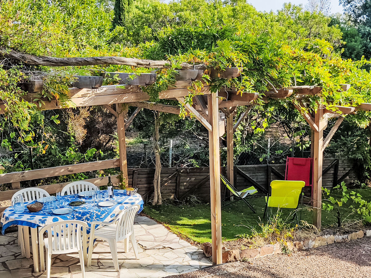 Terrasse 15 m2 partiellement couverte, situation sud-est, tonnelle 10 m2.
