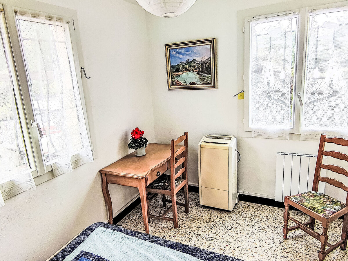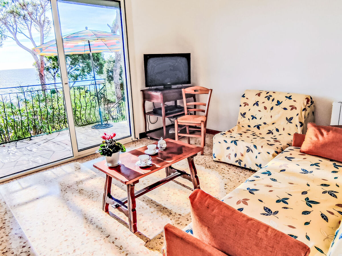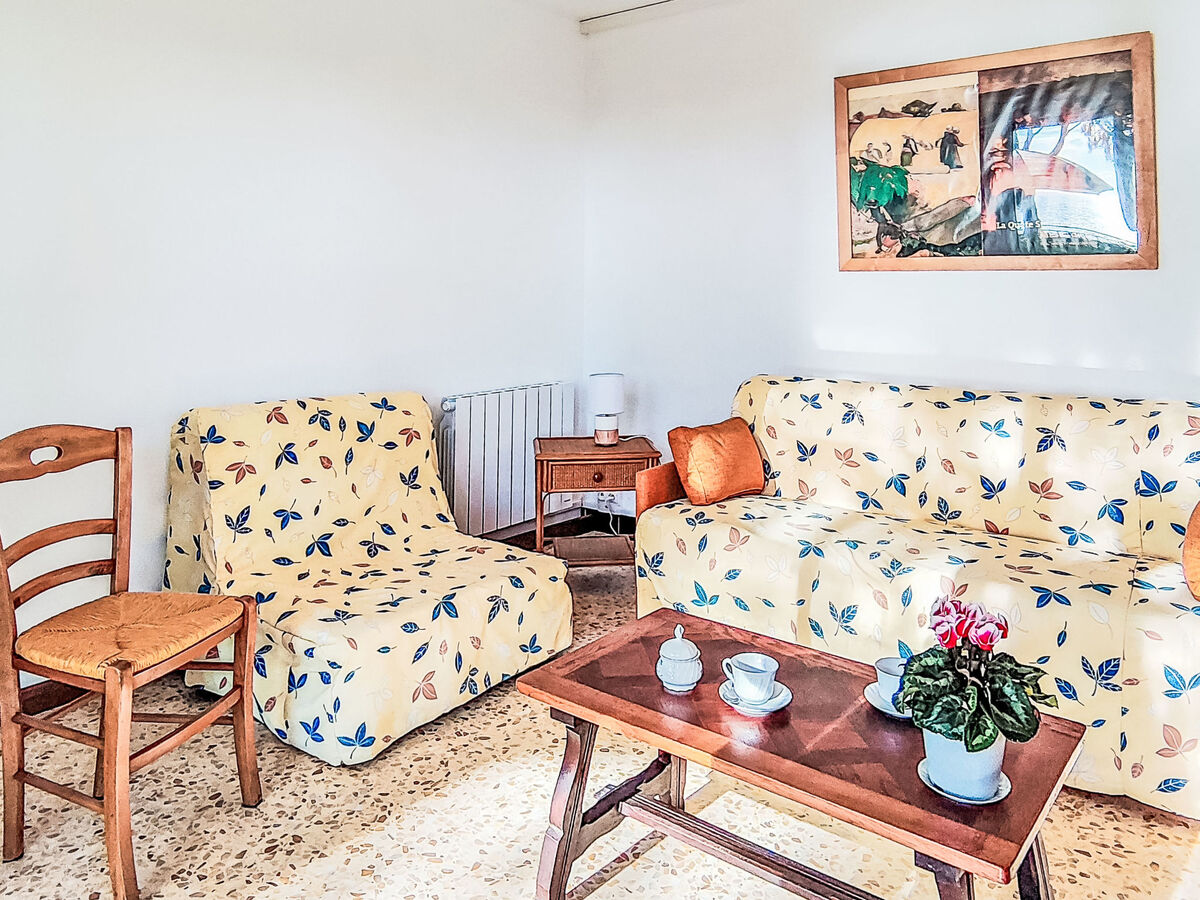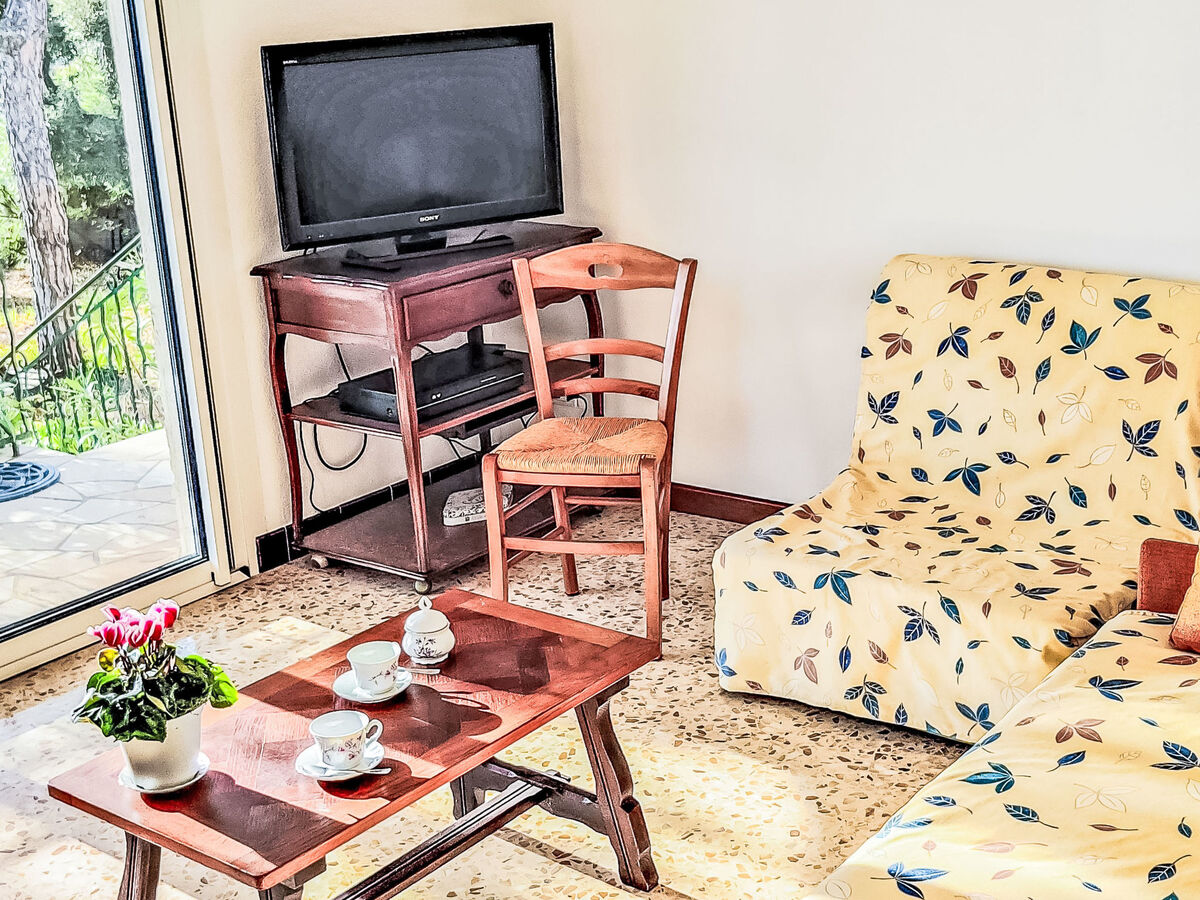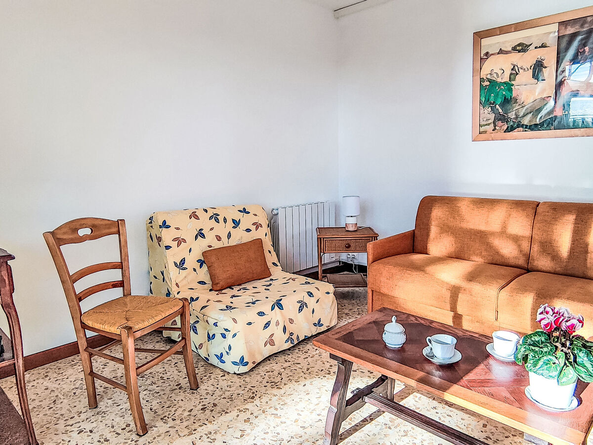 Clair, aménagement confortable: séjour/salle à manger avec 1 divan-lit double (140 cm, longueur 200 cm), TV, écran plat et ventilateur.