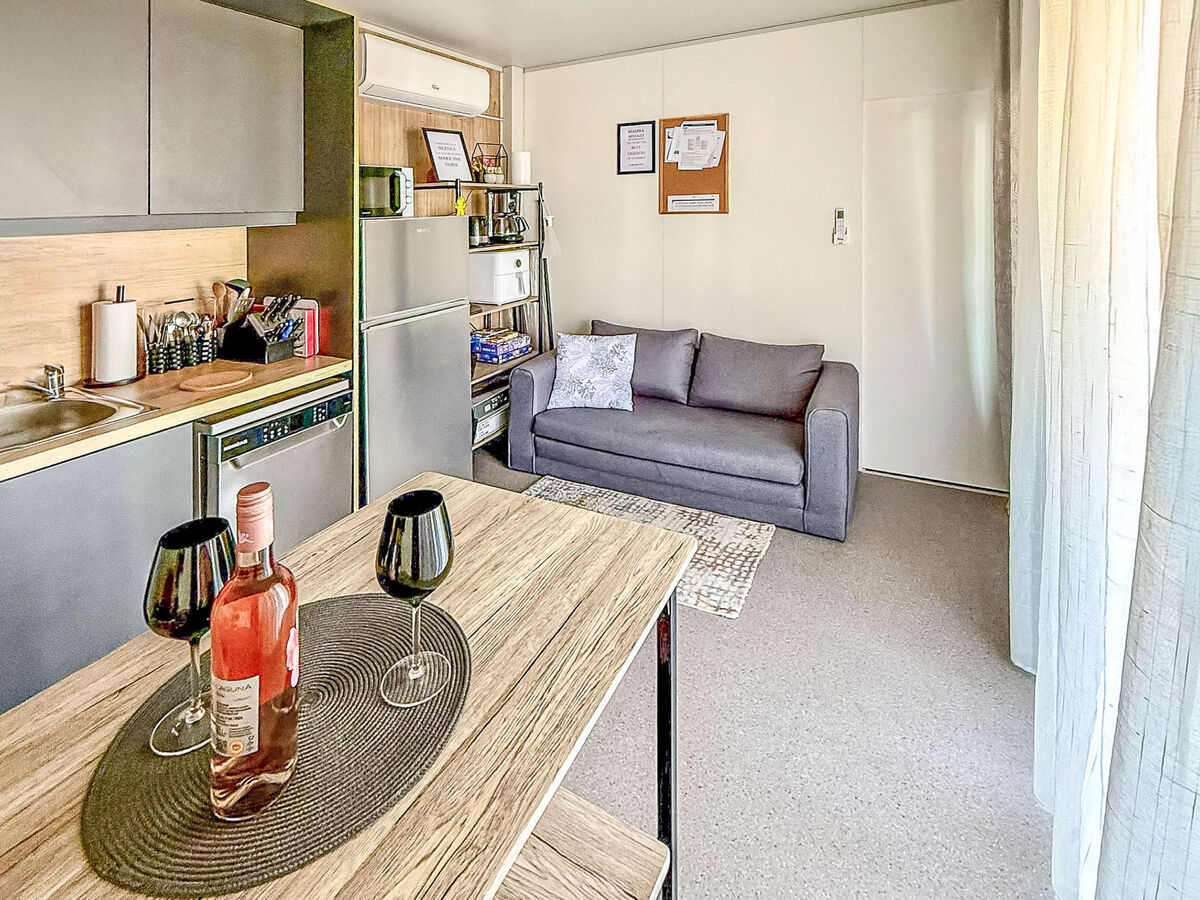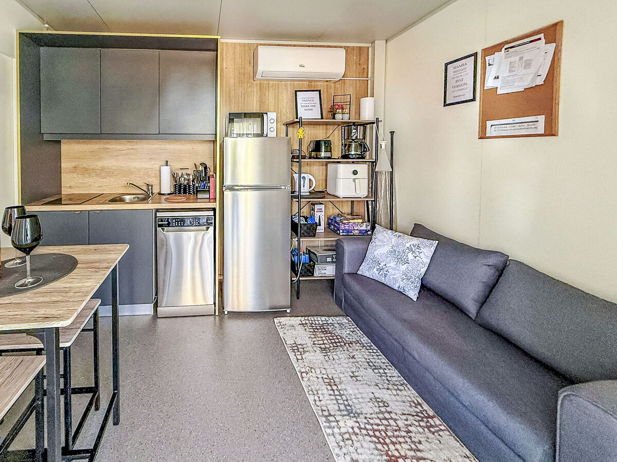 Cuisine ouverte (four, lave-vaisselle, 2 plaques vitrocéramiques, congélateur, cafetière électrique).