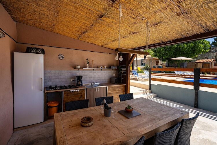 Conçue dans un souci de confort et de détente, la villa dispose de quatre chambres confortables et climatisées et de trois salles de bains modernes, ce qui la rend idéale pour les familles ou les groupes d'amis. La cuisine ouverte et la salle à manger s'intègrent parfaitement à l'élégant salon, créant une atmosphère chaleureuse et accueillante. À l'extérieur, vous découvrirez une belle cour remplie de surprises agréables, votre piscine privée avec chaises longues et parasols, un billard pour vous amuser entre amis, un trampoline pour les plus petits et une terrasse couverte parfaite pour de longs repas tranquilles au soleil. L'espace extérieur comprend également un barbecue, des sièges ombragés et des toilettes supplémentaires dans la cour pour plus de commodité. Chaque détail ici vous invite à la détente, que vous soyez en train de nager, de dîner en plein air ou simplement de profiter du calme de la nature environnante.