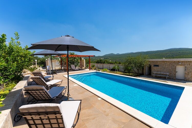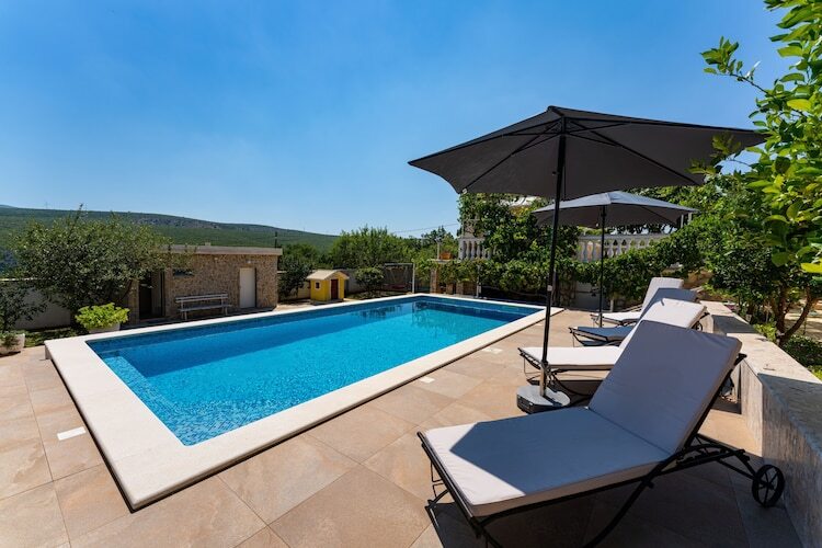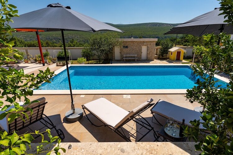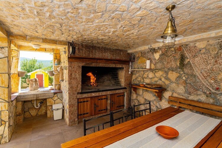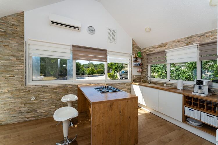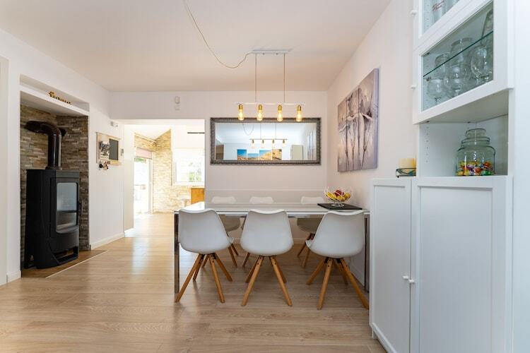 L'intérieur, magnifiquement meublé, comprend un salon et une salle à manger lumineux qui s'ouvrent directement sur la terrasse, une cuisine entièrement équipée, trois chambres confortables et deux salles de bains modernes. À l'extérieur, vous trouverez une piscine privée avec fonction d'hydromassage, des chaises longues et une douche extérieure. La grande terrasse couverte offre un coin salon confortable et un coin repas avec barbecue et cheminée ouverte, idéal pour profiter des longues soirées d'été sous les étoiles.