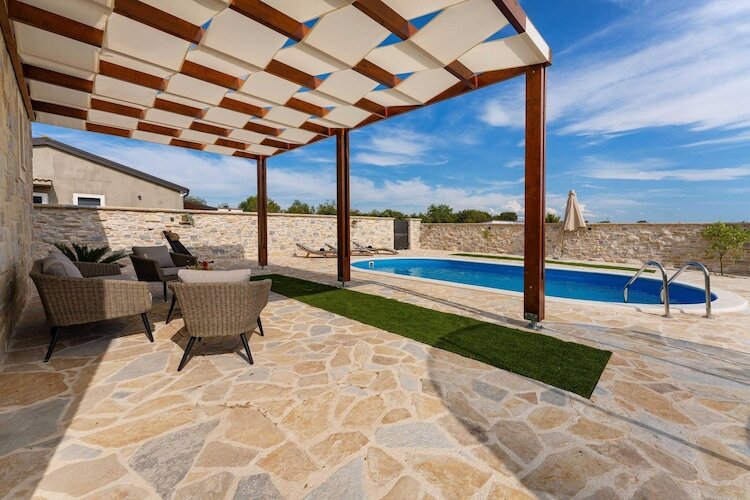 L'intérieur lumineux comprend une cuisine entièrement équipée, un salon confortable avec canapé-lit, une salle de bains moderne et une chambre avec deux lits simples. À l'extérieur, vous trouverez un jardin privé clôturé avec une piscine rafraîchissante, des chaises longues et une terrasse couverte avec coin repas. Un barbecue traditionnel en pierre et un trampoline pour enfants en font un lieu idéal pour se détendre et s'amuser en famille.