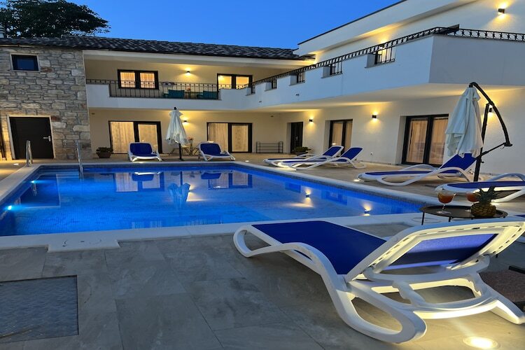 Cette villa de vacances moderne est située dans le village tranquille de Gornje Raštane, à seulement 10 minutes en voiture de la plage la plus proche. Offrant une intimité totale, un design élégant et un agencement spacieux, c'est le lieu de villégiature idéal pour les familles ou les groupes jusqu'à 10 personnes. La cour entièrement clôturée comprend une piscine privée, une cuisine extérieure, un coin repas couvert et un barbecue, créant ainsi le cadre idéal pour se détendre et se retrouver sous le soleil dalmate.