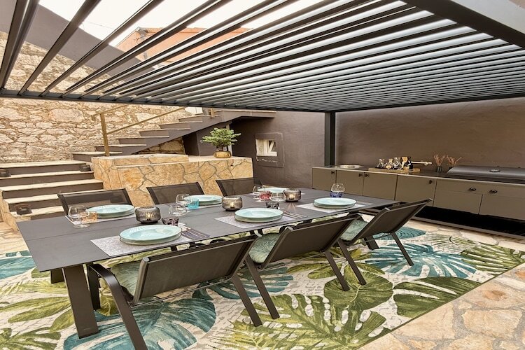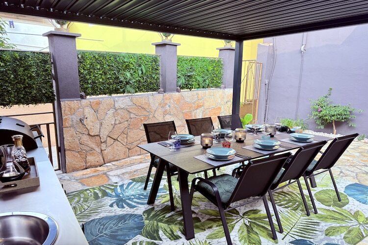 À l'intérieur, les hôtes sont accueillis dans un espace chaleureux et soigneusement conçu, comprenant deux chambres climatisées, deux salles de bains modernes et une cuisine entièrement équipée avec lave-vaisselle et tous les équipements essentiels. La salle à manger et le salon confortable créent un cadre agréable pour passer des soirées relaxantes. L'espace extérieur est tout aussi accueillant, avec une cour privée clôturée, une terrasse couverte avec une cuisine extérieure et une table à manger, ainsi qu'un coin salon confortable, parfait pour prendre ses repas en plein air ou se détendre après une journée à la plage.