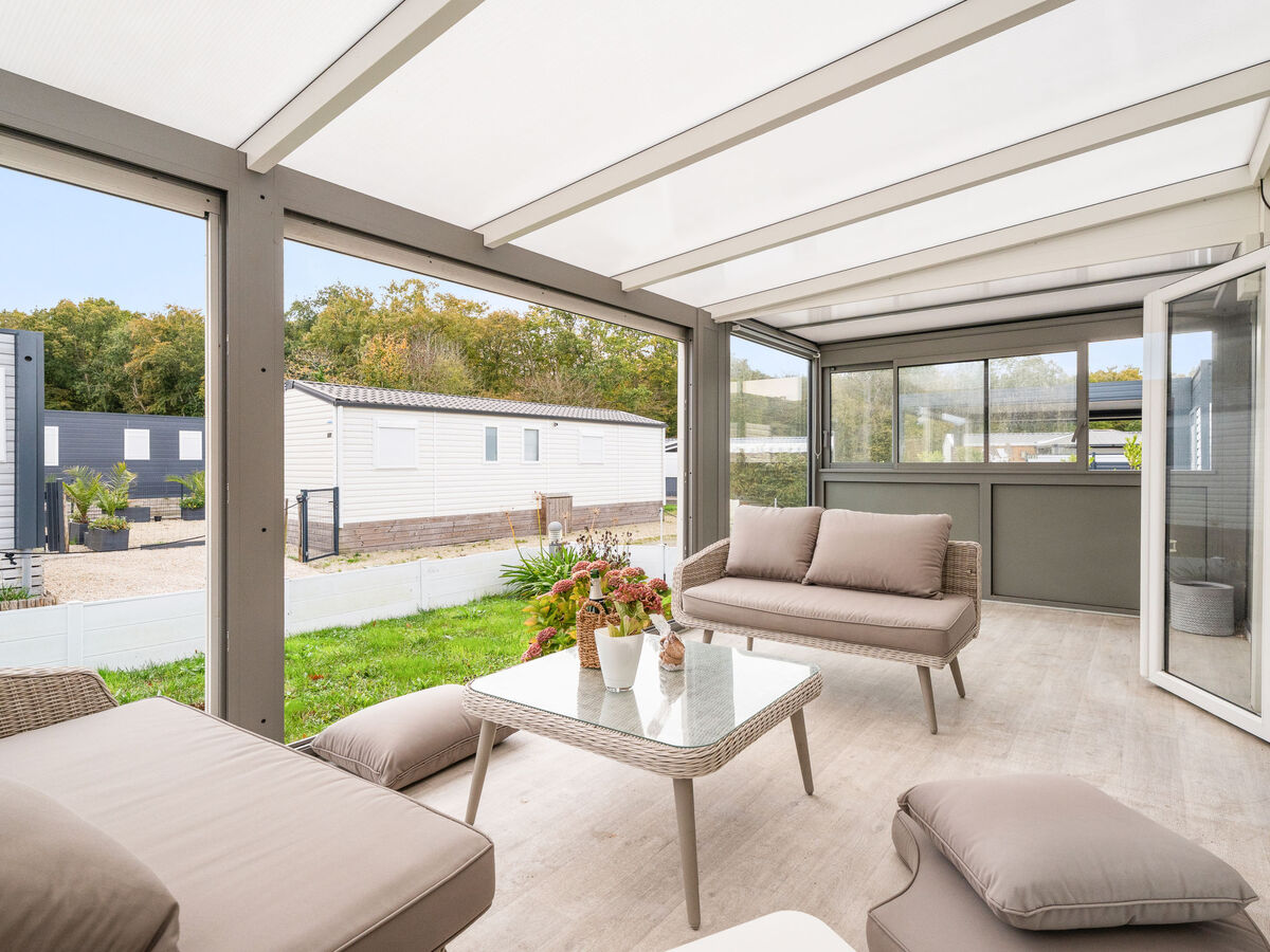 Aménagement confortable et agréable: séjour/salle à manger avec véranda avec 1 divan-lit et TV (écran plat).
