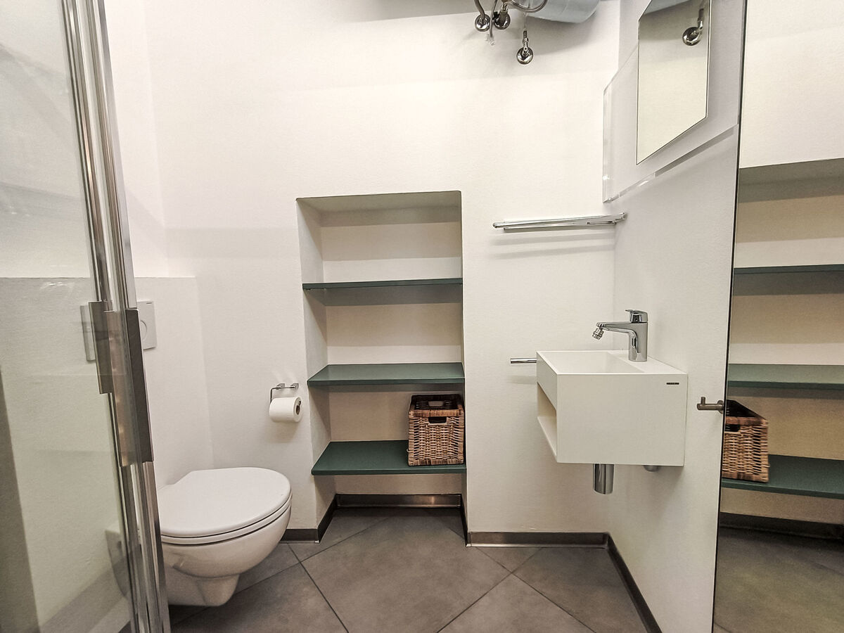 1 chambre double, mansardée avec baie vitrée avec 1 grand-lit, lavabo et douche/WC.