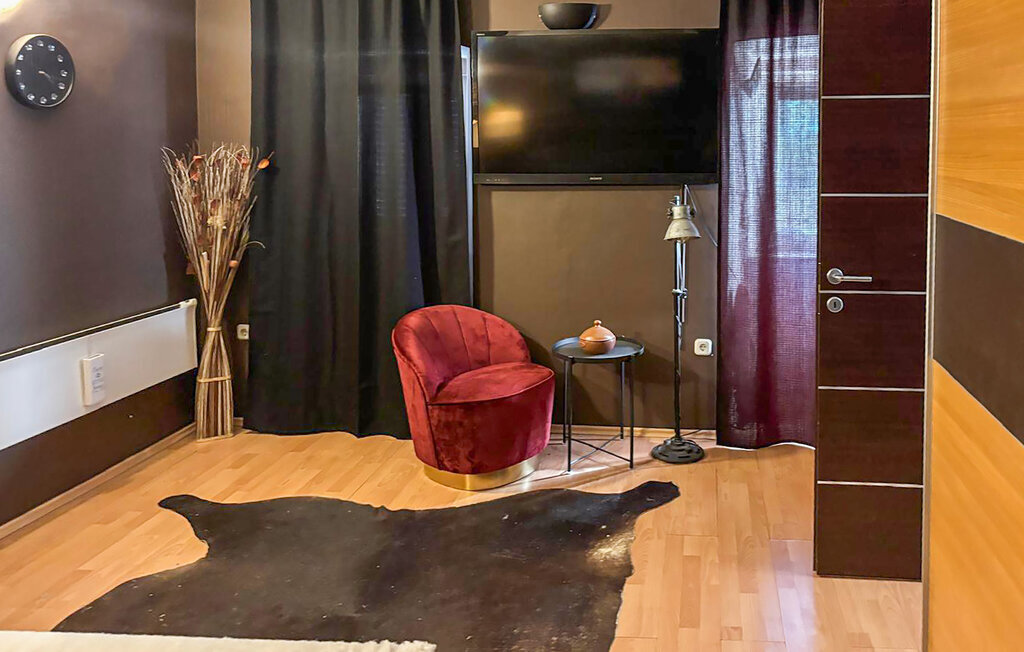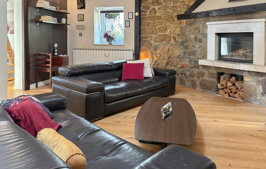 Cette maison allie le charme rustique et le confort moderne. Le mur en pierre naturelle et le sol en bois créent une atmosphère chaleureuse et accueillante, tandis que les canapés en cuir et les meubles élégants confèrent à la pièce un caractère élégant et contemporain. Faites le plein d'énergie ici, que ce soit pour une soirée conviviale autour d'un film ou d'un jeu, pour jouer aux fléchettes ou pour cuisiner ensemble.