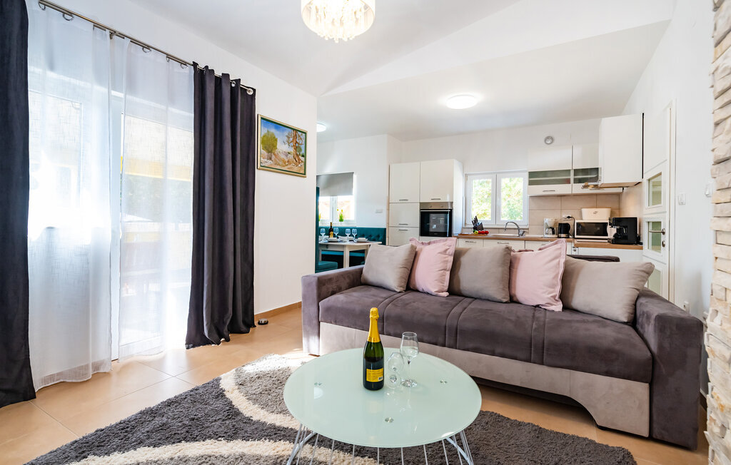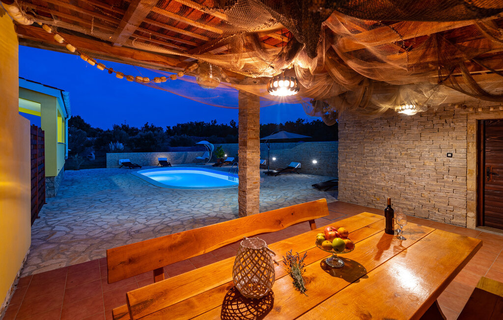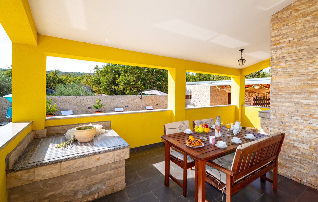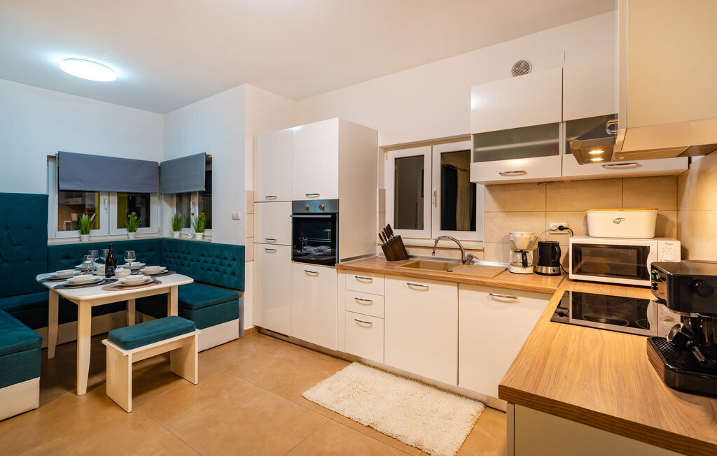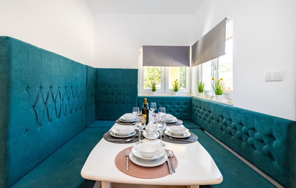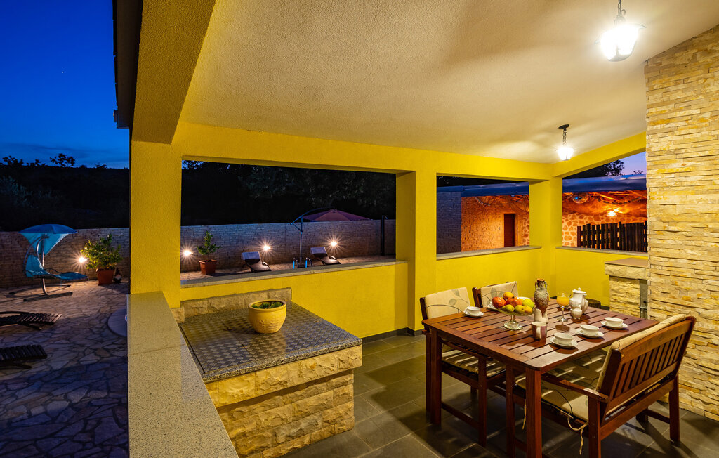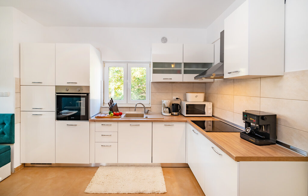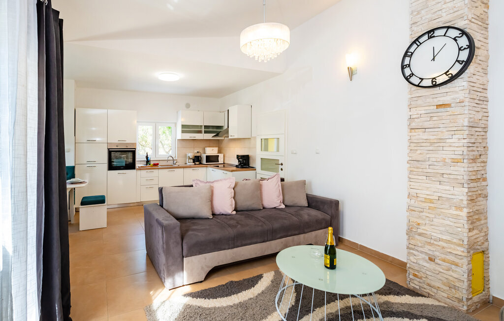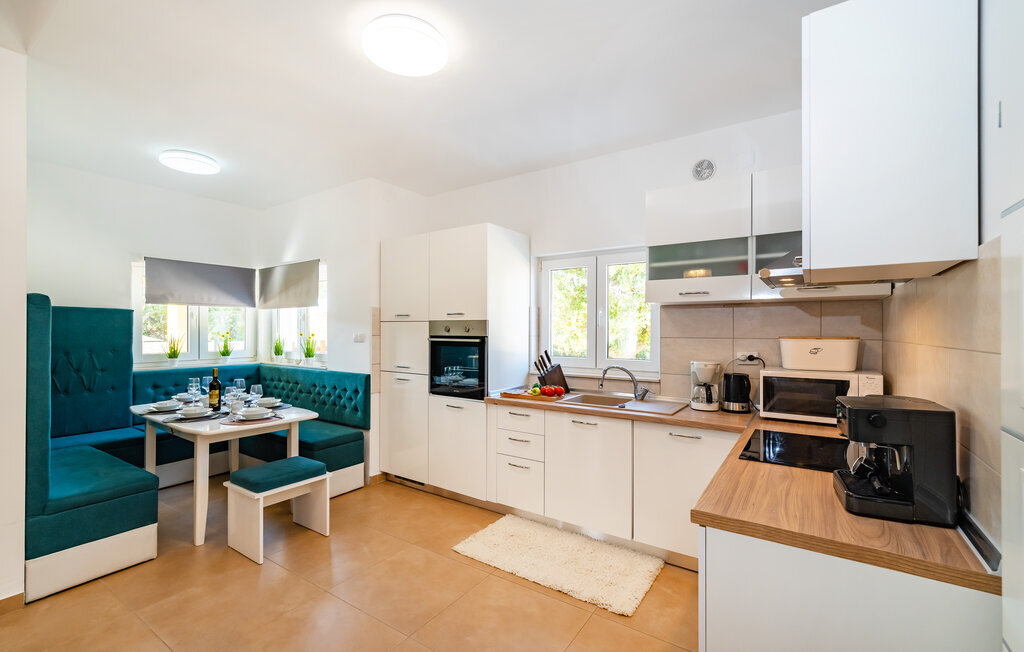 Passez des journées inoubliables dans votre maison de vacances de luxe qui allie confort, calme et joie de vivre dalmate. Vous trouverez ici le lieu de retraite idéal pour les familles ou les couples en quête de repos, de soleil et d'intimité. Profitez de l'atmosphère lumineuse de la maison, aménagée avec goût, et détendez-vous dans le salon élégant avec ses canapés confortables et ses jolis détails en pierre et en bois. Préparez vos plats préférés dans la cuisine spacieuse avec un grand plan de travail ou commencez la journée par un petit déjeuner dans le coin repas confortable.
