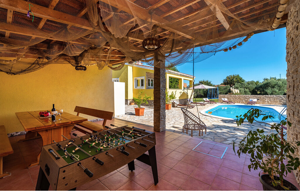 Sortez et rafraîchissez-vous dans la piscine privée ou détendez-vous sur les chaises longues sous le grand parasol. Profitez de la terrasse couverte avec une table en bois rustique pour prendre vos repas en plein air. Faites une partie de baby-foot pendant que les enfants s'amusent dans le jardin ou sur l'aire de jeux. À l'ombre des arbres, vous trouverez en outre des retraites idylliques pour des moments de calme.