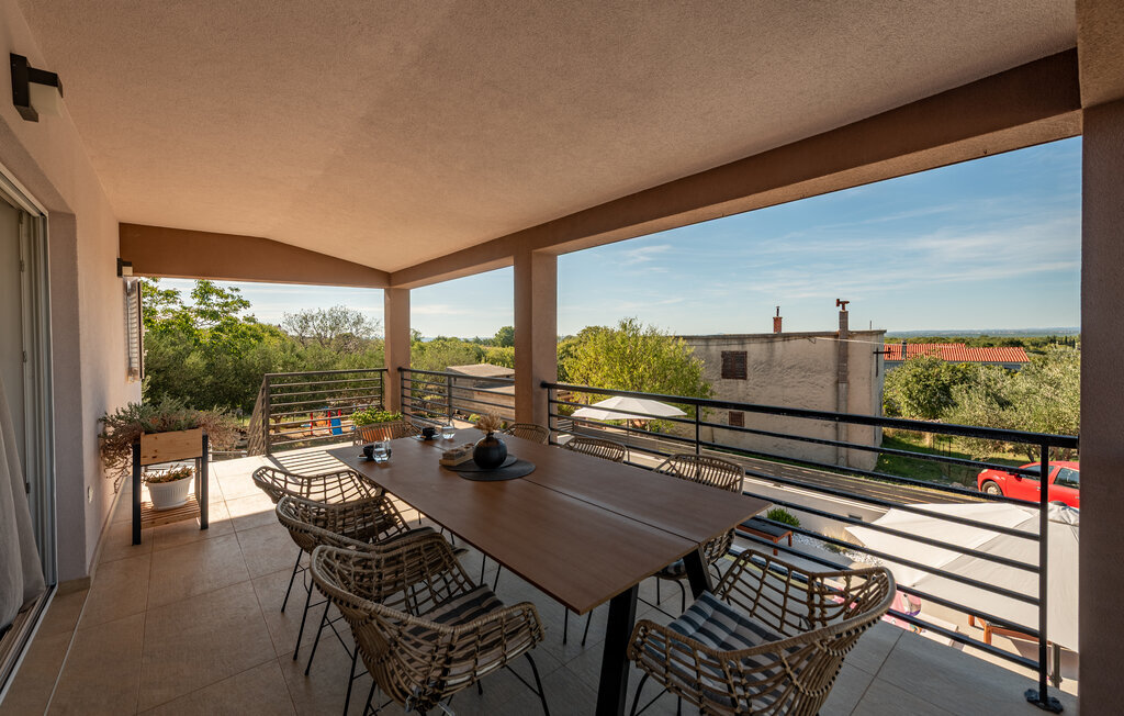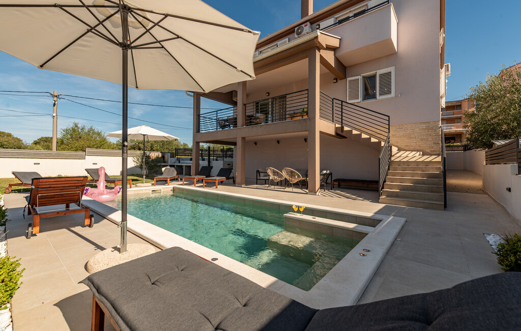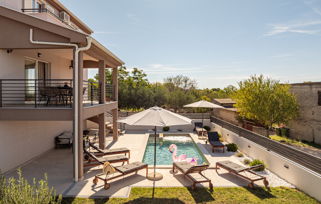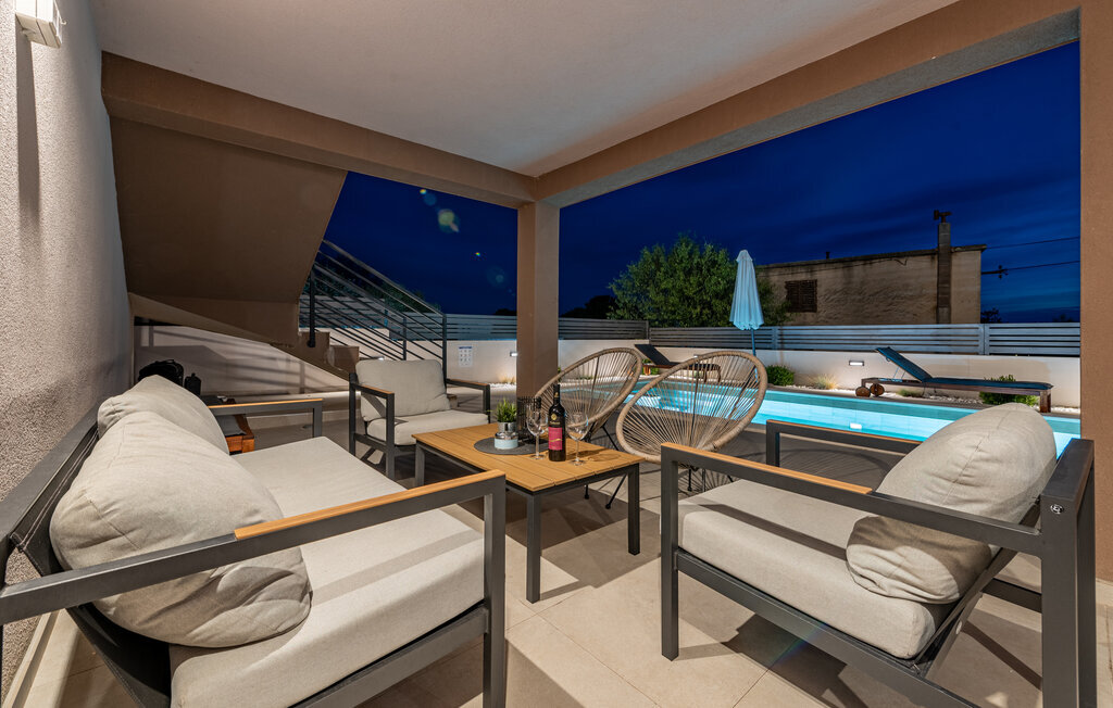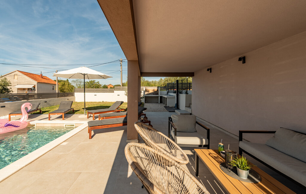 Profitez de moments conviviaux sur la terrasse couverte avec vue sur la piscine et beaucoup de place pour les repas en commun. Sautez dans l'eau pour une baignade rafraîchissante et faites un tour avant de vous détendre au soleil sur les chaises longues confortables. Le soir, l'éclairage d'ambiance autour de la piscine crée une ambiance particulière et vous invite à passer de longues soirées d'été autour d'un verre de vin.