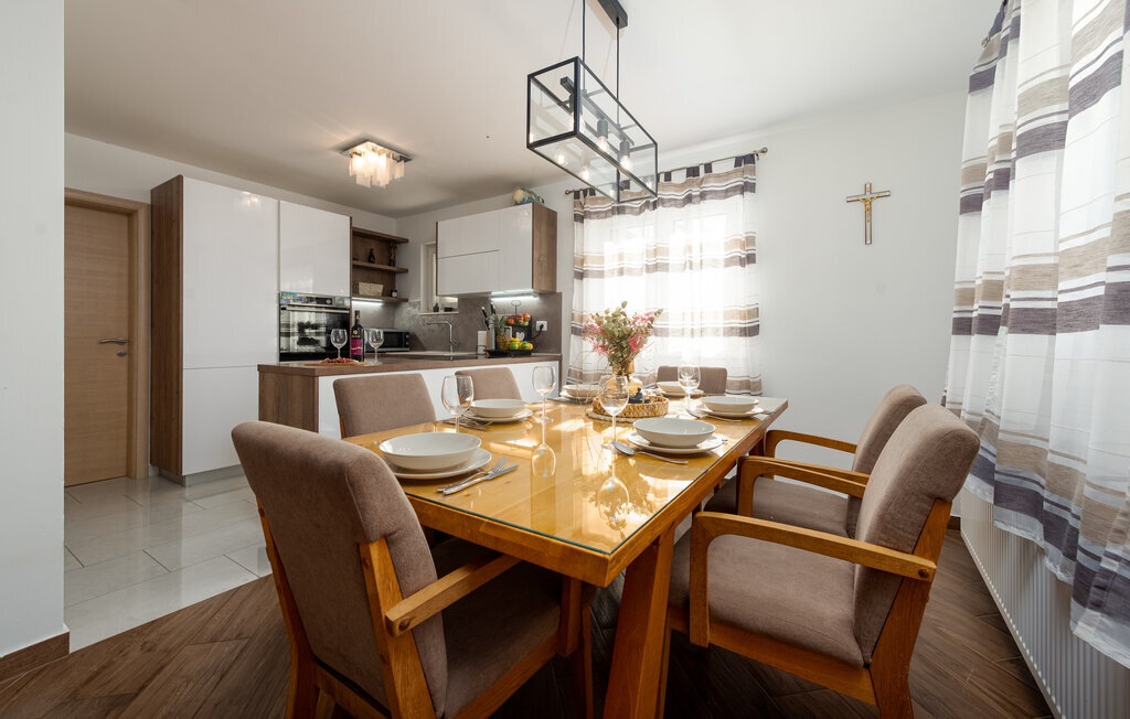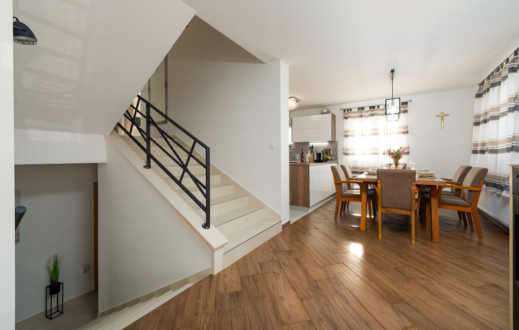 L'aménagement de cette maison vous accueille avec des lignes épurées, des couleurs claires et des accents soigneusement choisis qui créent une atmosphère paisible. Dans le salon confortable, le grand canapé vous invite à passer des heures de détente devant la télévision ou avec un bon livre. Dans la cuisine moderne, vous pouvez cuisiner ensemble et essayer des spécialités régionales. Profitez d'une pause dans votre quotidien dans une ambiance qui allie harmonieusement confort et convivialité.