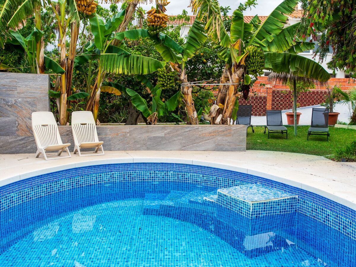 La terrasse de la maison est d'une superficie de 18 m². Elle est couverte et équipée d'un barbecue et de meubles de jardin. La villa est entourée d'un terrain de 500m² et d'un jardin. La piscine est d'une superficie de 4 x 6 m.