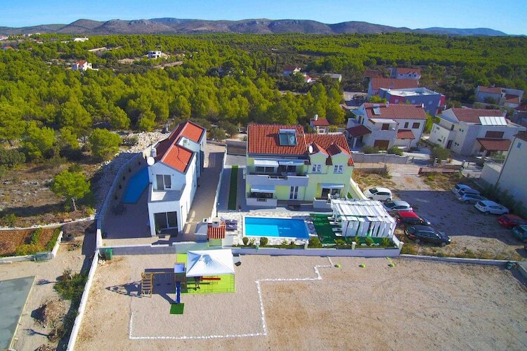 Ici, vous trouverez du confort, de l'intimité et un emplacement parfait, le tout en un seul endroit ! Cette belle villa avec piscine privée et excellente zone de bien-être est située à Brodarica, une banlieue paisible, à seulement 300 m de la plage et à 6 km de la pittoresque ville historique de Šibenik. Votre villa s'étend sur deux étages et offre deux appartements entièrement équipés, ce qui en fait une retraite balnéaire parfaite pour 2 familles ou un groupe allant jusqu'à 10 invités. L'intérieur de votre maison de vacances conviviale pour les animaux de compagnie se compose de 5 chambres, 4 salles de bains et 2 salons/salles à manger élégants, tous deux reliés à des cuisines ouvertes entièrement équipées. Il y a également une salle de loisirs avec des équipements de fitness ainsi qu'un sauna à votre disposition. Une grande terrasse couverte située à l'étage supérieur offre une vue à couper le souffle sur la mer Adriatique et les îles voisines. La zone extérieure est entièrement clôturée et comprend votre piscine privée, une charmante terrasse couverte bien équipée avec du mobilier d'extérieur, des installations de barbecue, une aire de jeux pour enfants et beaucoup d'espace de stationnement couvert. Nous sommes heureux de vous proposer cette propriété car nous avons vérifié la villa en personne. Lors d'une visite de My Dalmatia, nous avons été particulièrement impressionnés par l'hospitalité de vos hôtes. Ils offrent un mouillage près de la maison, gratuit, et si vous séjournez pendant une période de 2 semaines ou plus, ils vous emmèneront dîner dans une taverne située dans un village voisin. À moins de 500 m, vous trouverez tout ce dont vous avez besoin : la plage, un magasin d'alimentation et un restaurant. Solaris, une grande station touristique moderne qui propose de nombreuses activités, n'est qu'à 1 km. La charmante ville de Šibenik, avec ses petites rues étroites et ses petites tavernes, est accessible en 10 minutes en voiture. Cet emplacement fait de votre villa un point de départ parfait pour explorer le reste de la Dalmatie, car elle se trouve entre Split et Zadar, ce qui rend votre voyage court. De plus, le parc national le plus proche, Krka, n'est qu'à 20 minutes.