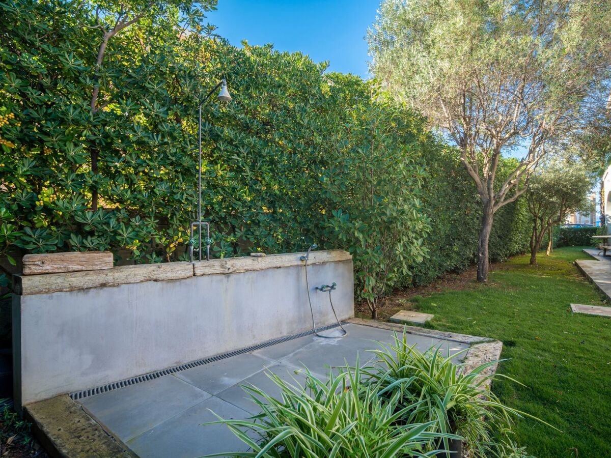 Douche extérieure, jardinet, tonnelle, meubles de jardin, barbecue.