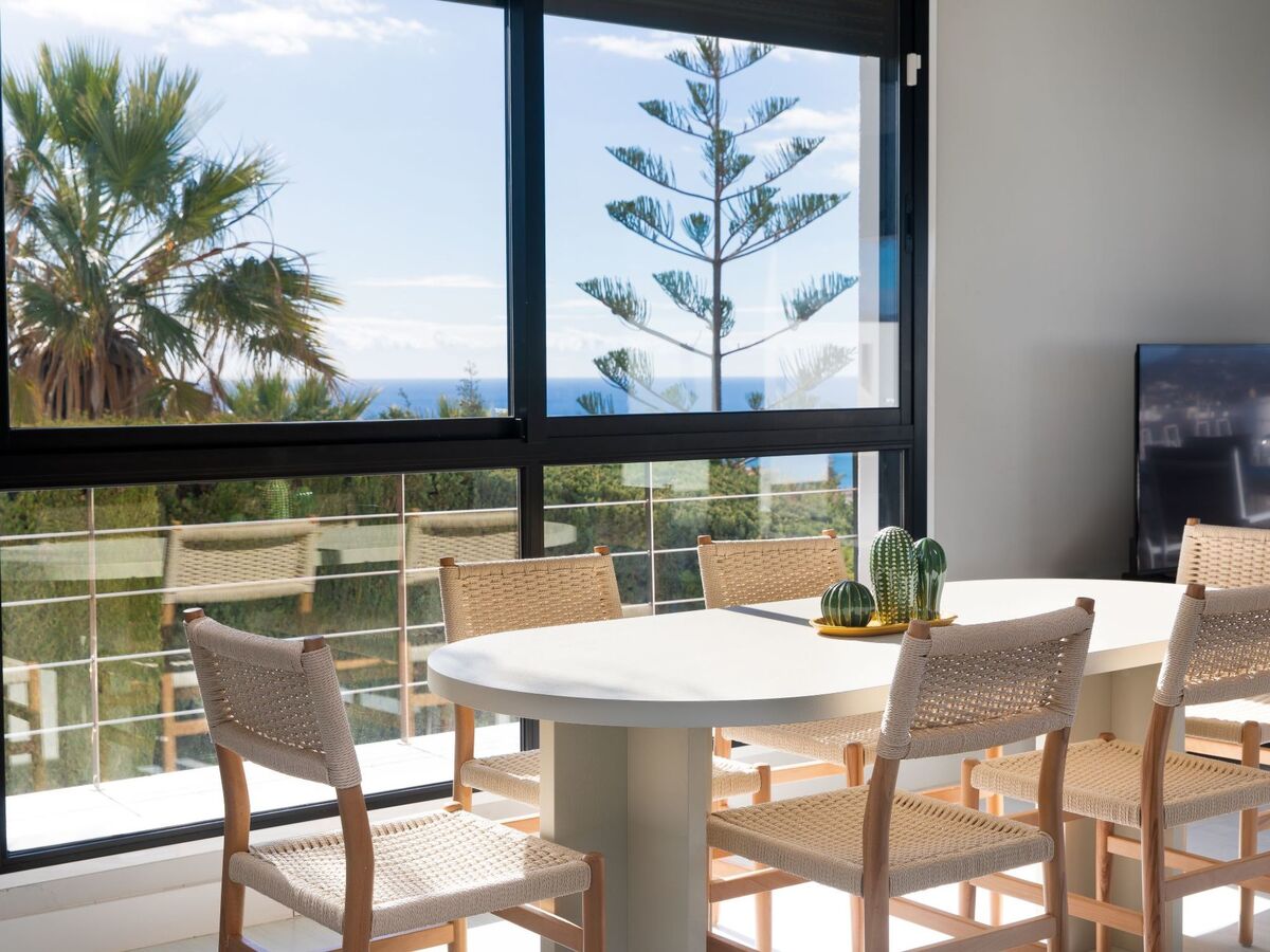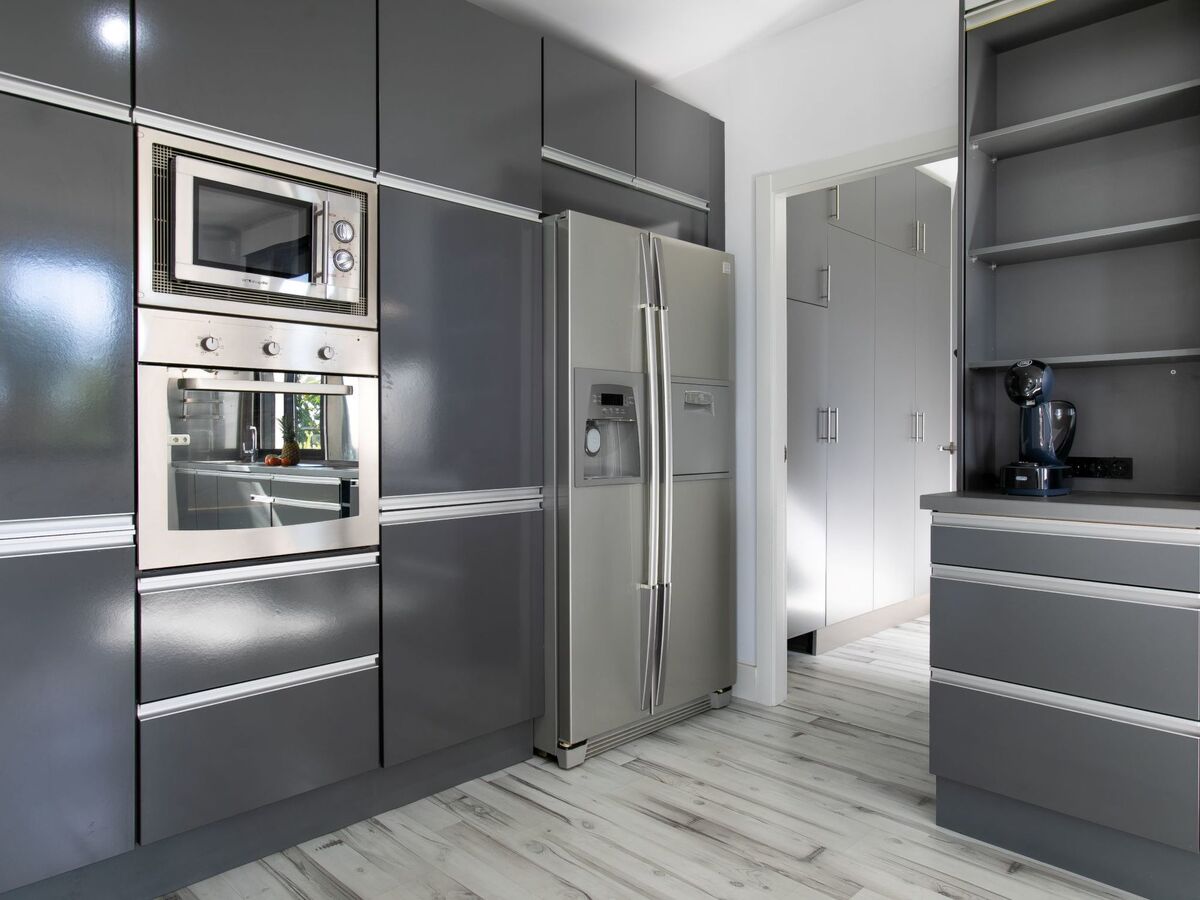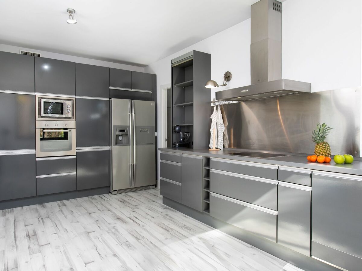 Cuisine (4 plaques de cuisson, four, lave-vaisselle, 3 plaques vitrocéramiques, grille-pain, bouilloire électrique, micro-ondes, congélateur, cafetière électrique, combiné micro-ondes) avec table pour les repas.
