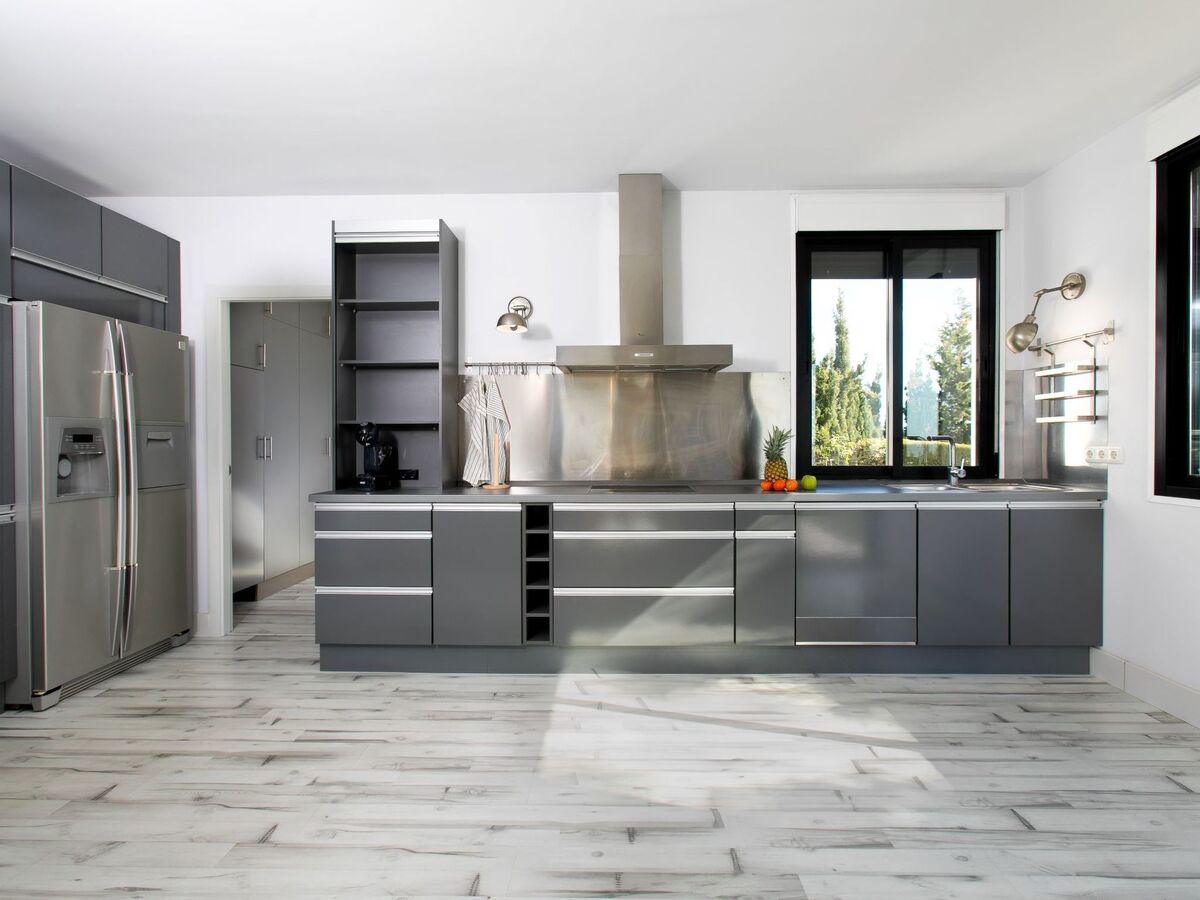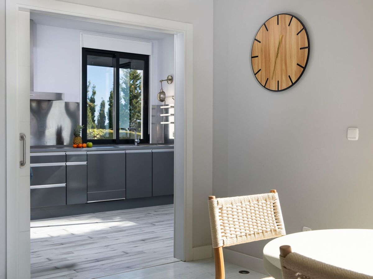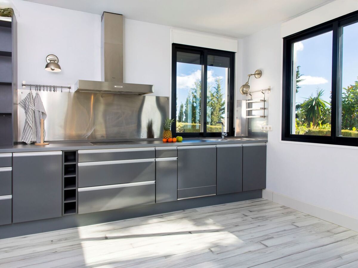 Cuisine (4 plaques de cuisson, four, lave-vaisselle, 3 plaques vitrocéramiques, grille-pain, bouilloire électrique, micro-ondes, congélateur, cafetière électrique, combiné micro-ondes) avec table pour les repas.