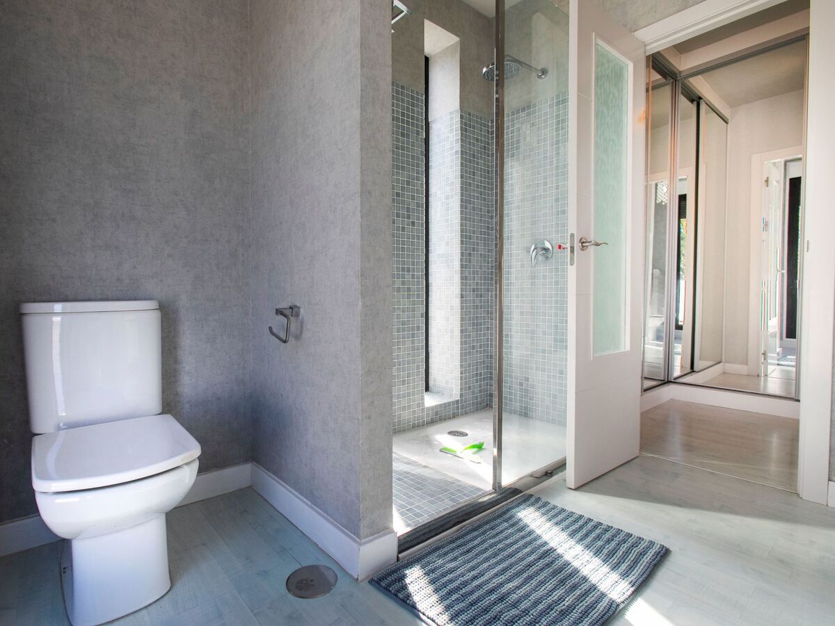 Douche extérieure, terrasse (70 m2), meubles de jardin.