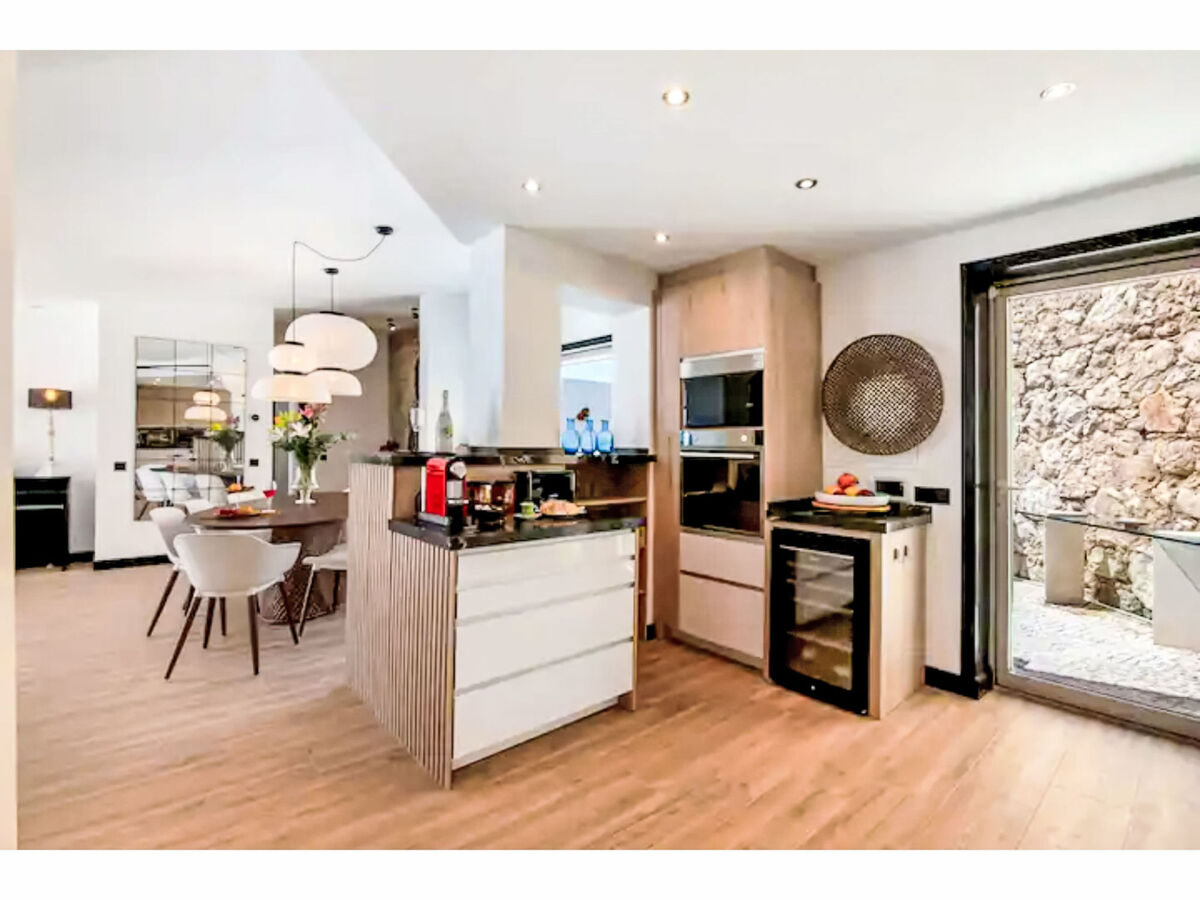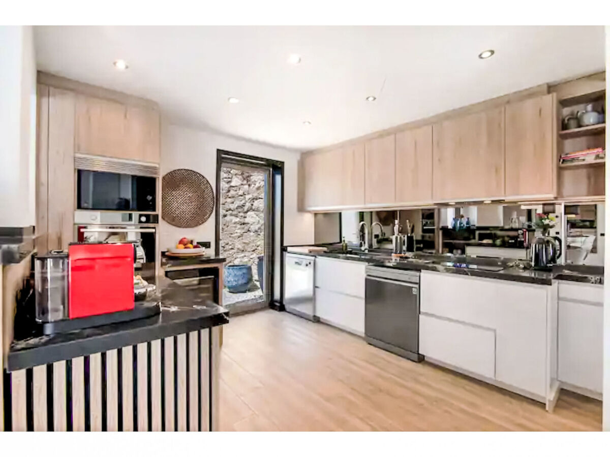 Cuisine ouverte (four, lave-vaisselle, 4 plaques vitrocéramiques, grille-pain, bouilloire électrique, micro-ondes).