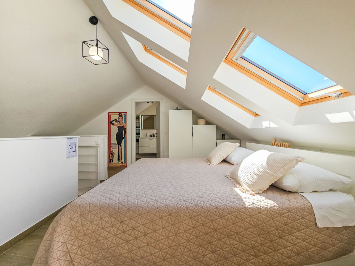 2ème étage: 1 chambre, hauteur plafond 70 - 220 cm avec 1 grand-lit (180 cm, longueur 200 cm), bain/WC et air-conditionné.