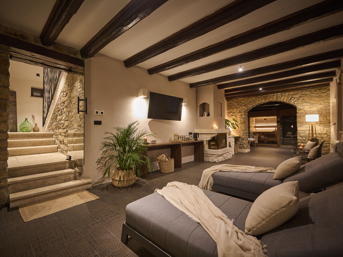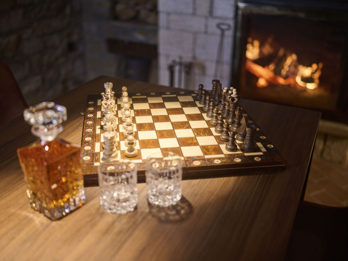 Spacieux, complètement rénovée en 2024, aménagement rustique et de bon goût: salle de billard avec cheminée et TV.