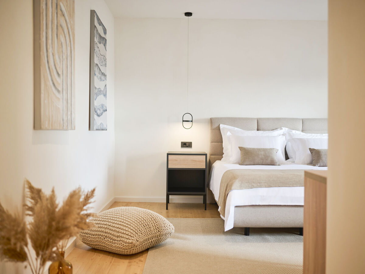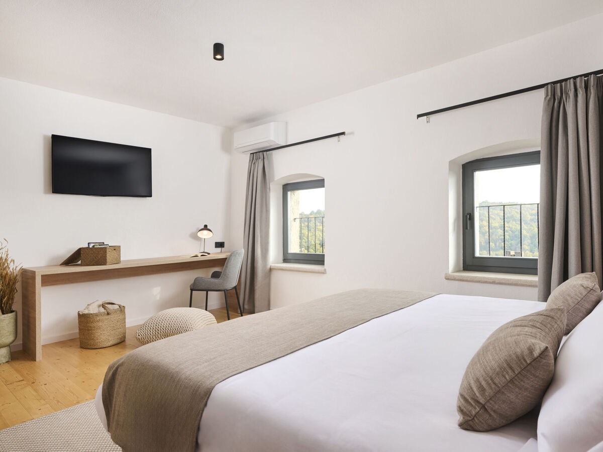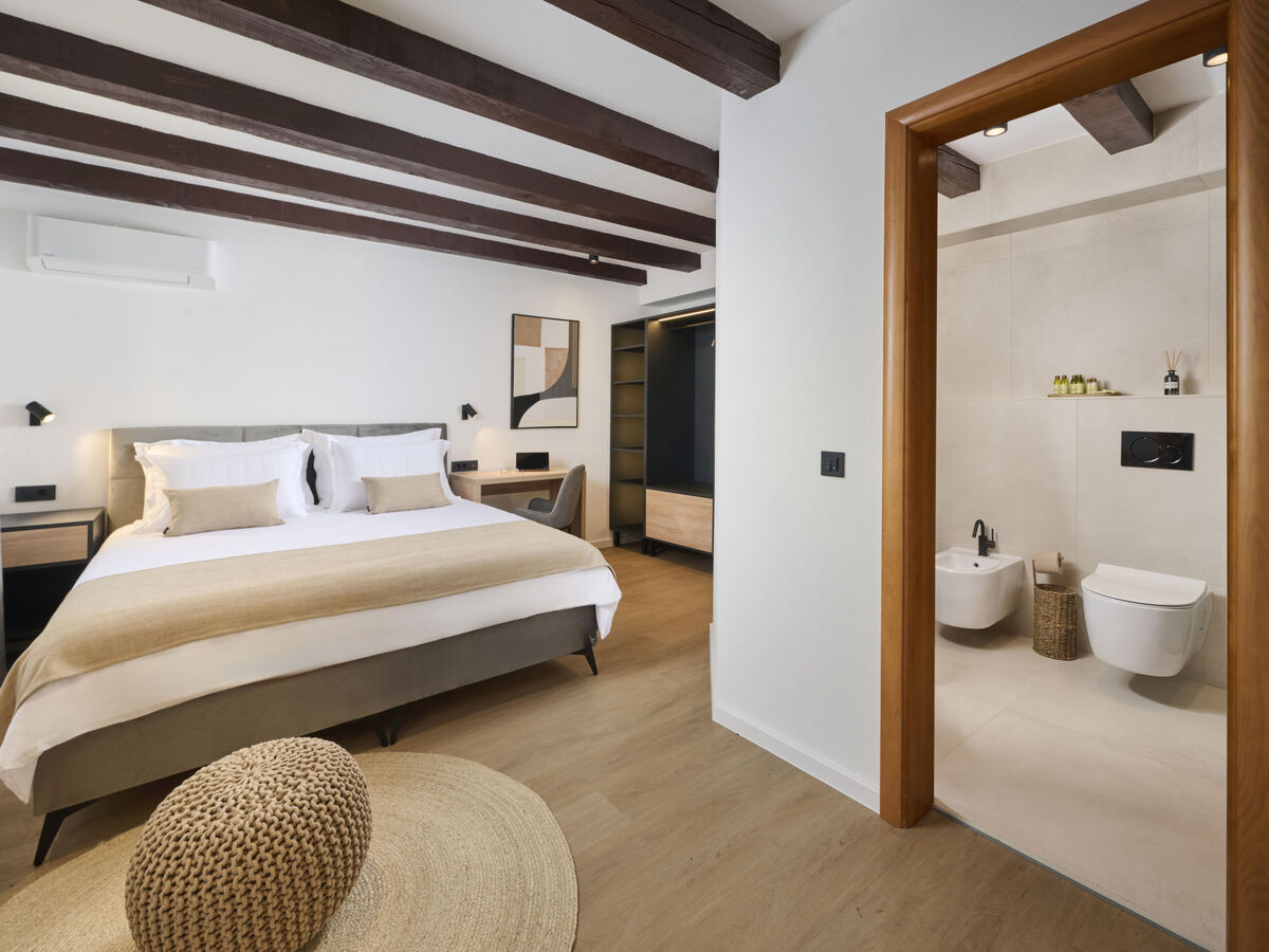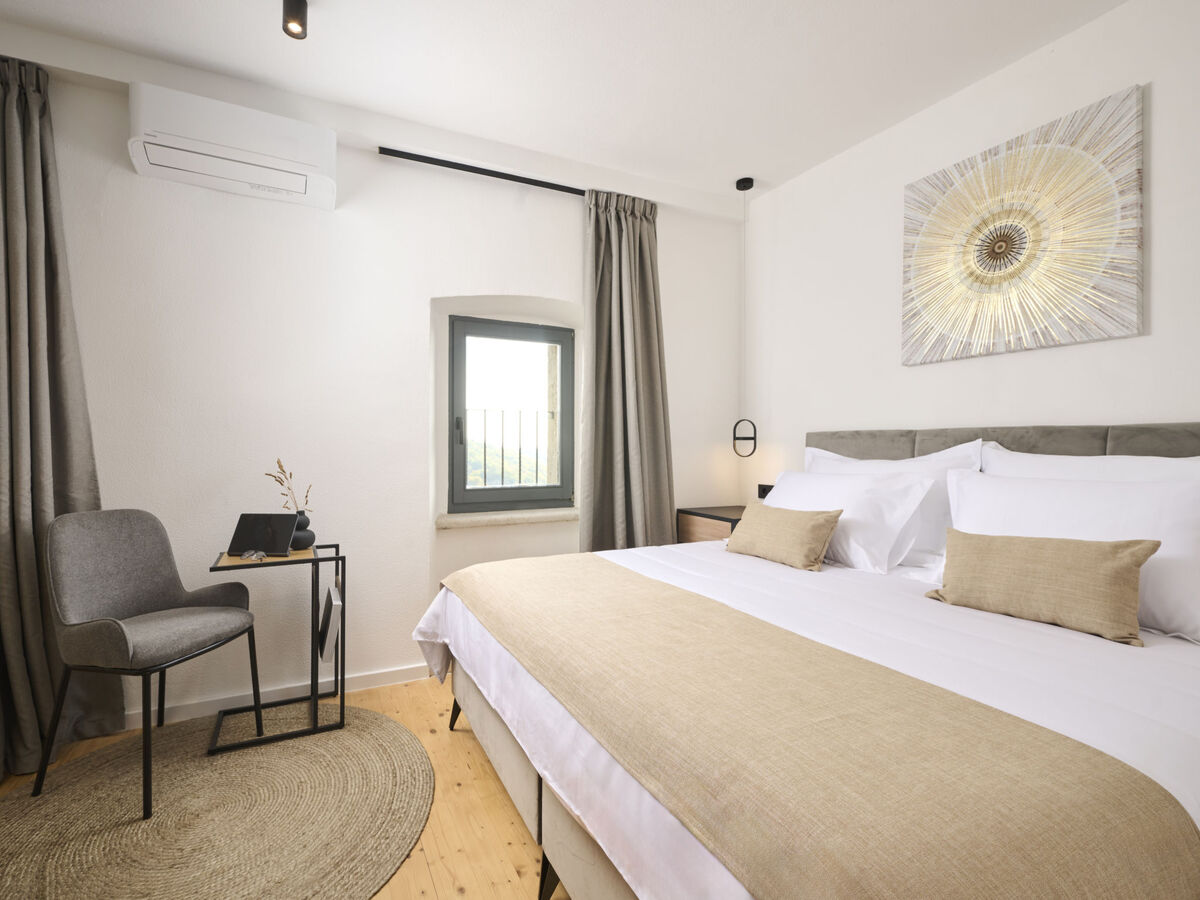 1 chambre avec 1 grand-lit (180 cm, longueur 200 cm), douche/bidet/WC, TV et air-conditionné.