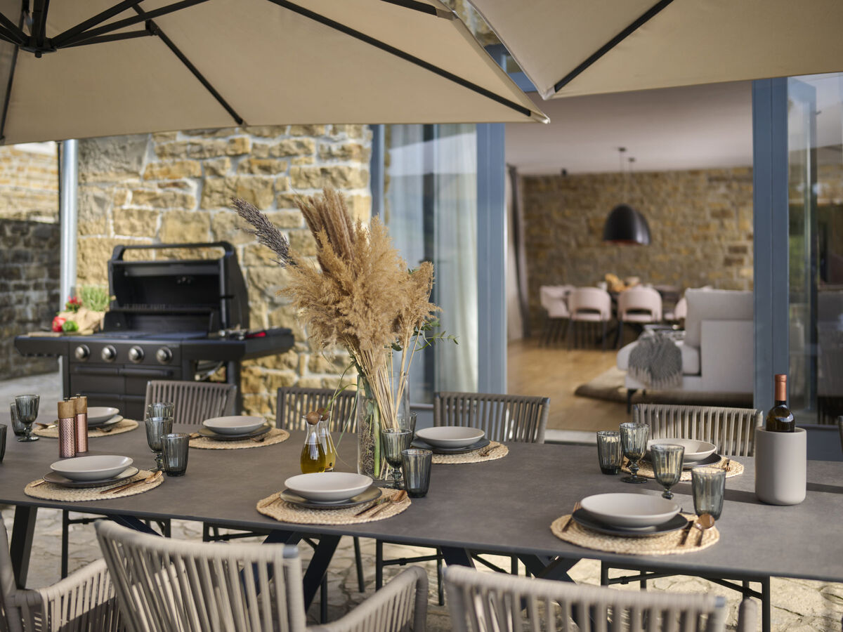 Meubles de terrasse, barbecue (portable), chaises longues.