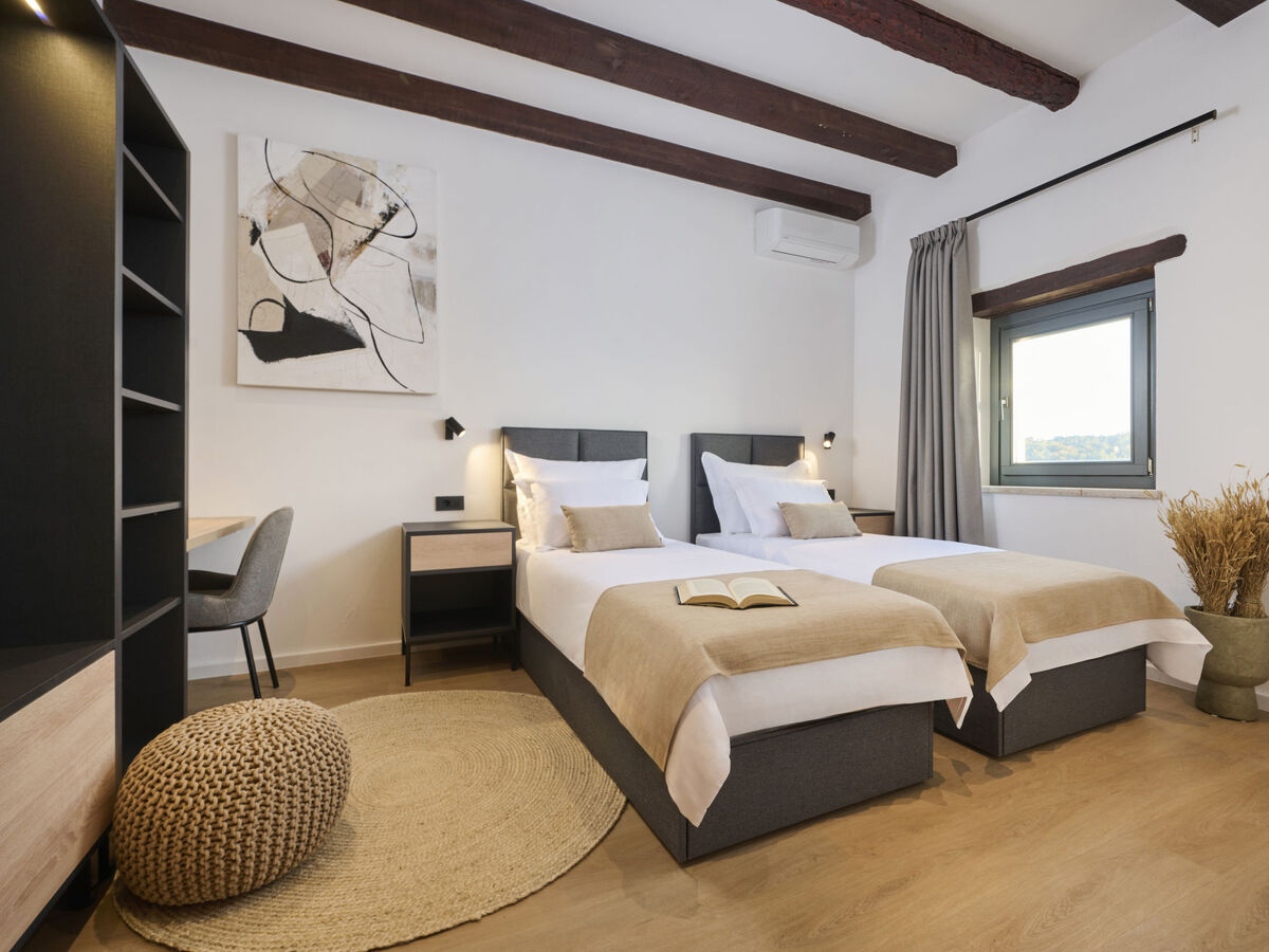 1 chambre avec 2 lits (90 cm, longueur 200 cm), douche/bidet/WC, TV et air-conditionné.