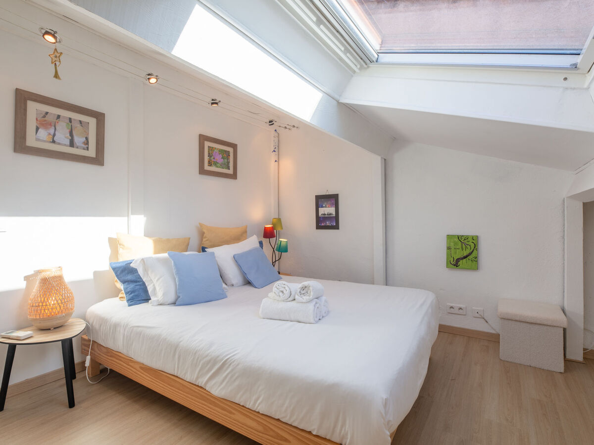 À l'étage supérieur: 1 chambre, mansardée avec 1 grand-lit (160 cm, longueur 200 cm), air-conditionné.