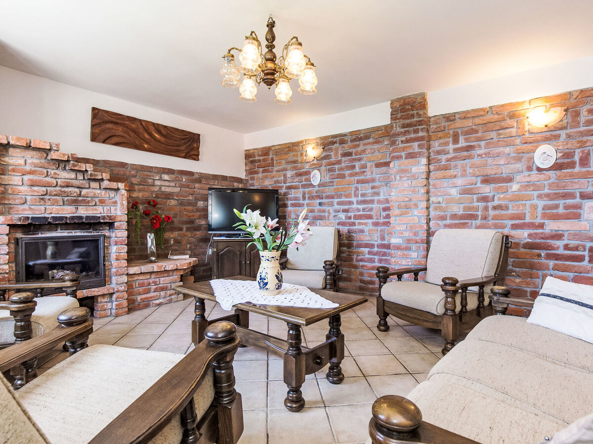 Séjour/salle à manger avec cheminée, TV (satellite) et air-conditionné.