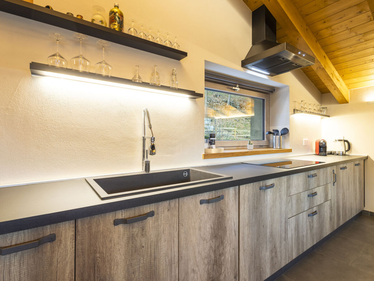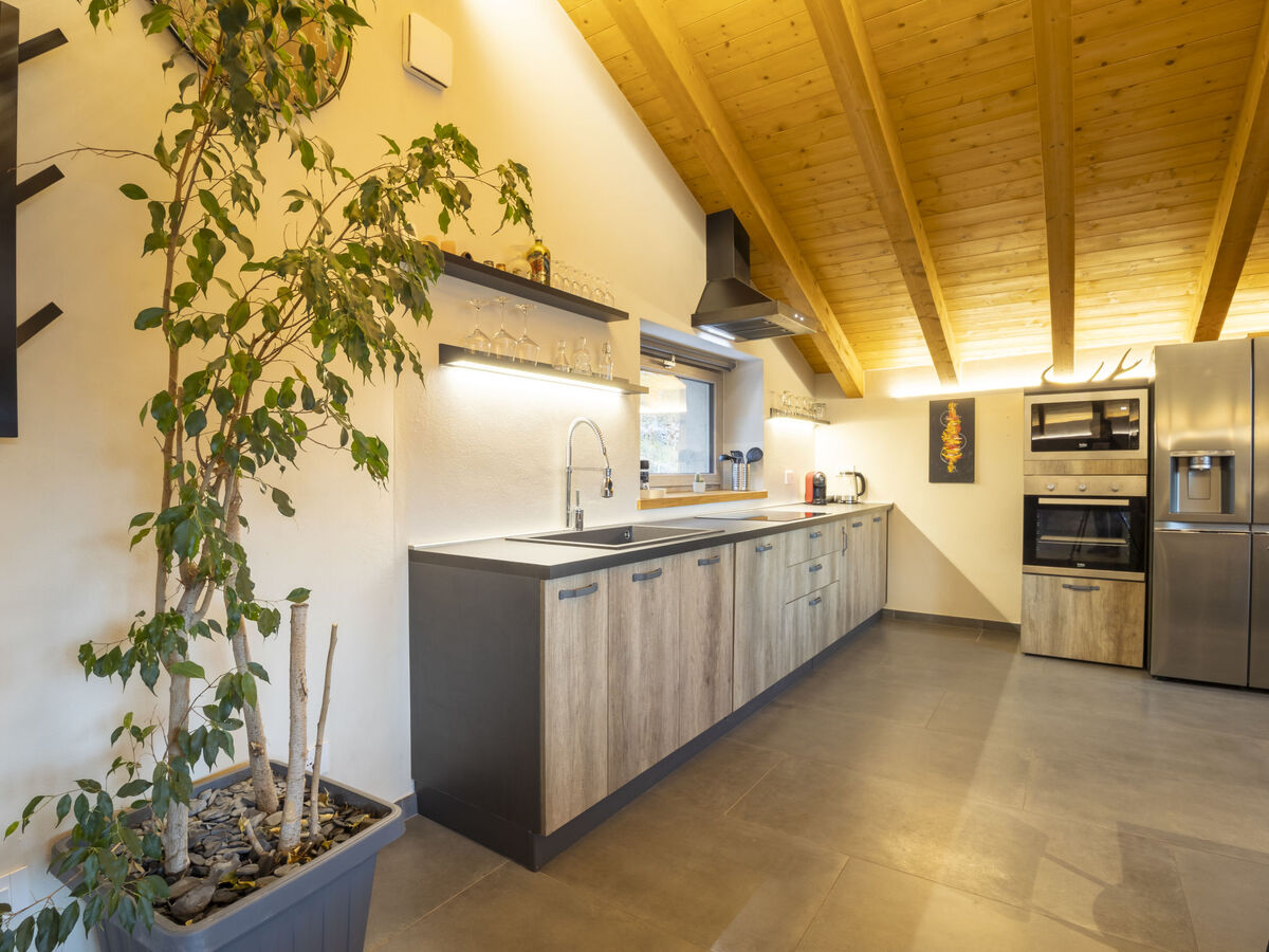 Grande coin cuisine (four, lave-vaisselle, 5 plaques à induction, grille-pain, bouilloire électrique, micro-ondes, congélateur, cafetière électrique, Capsules pour machine à café (Nespresso) inclus) avec table pour les repas et coin repas.