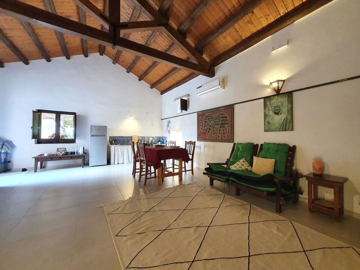 Aménagement confortable et rustique: séjour/salle à manger avec TV, air-conditionné et chauffage à air chaud.